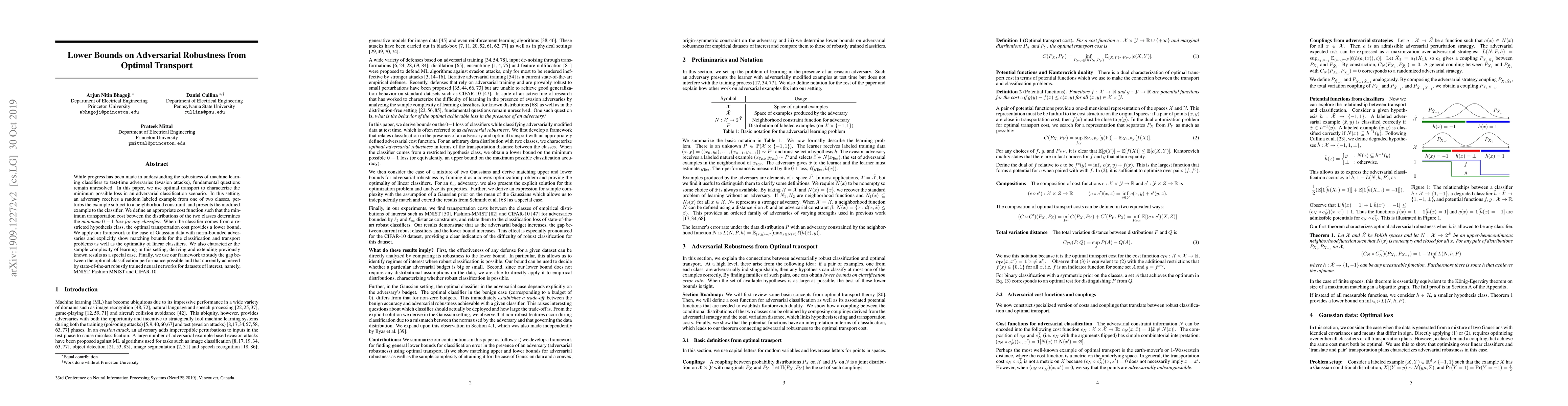 This paper uses optimal transport to determine the minimum possible loss in adversarial classification scenarios, establishing lower bounds for robustness. It applies the framework to Gaussian data and demonstrates the optimality of linear classifiers, while also analyzing the gap between optimal and current robust neural network performance on datasets like MNIST and CIFAR-10.