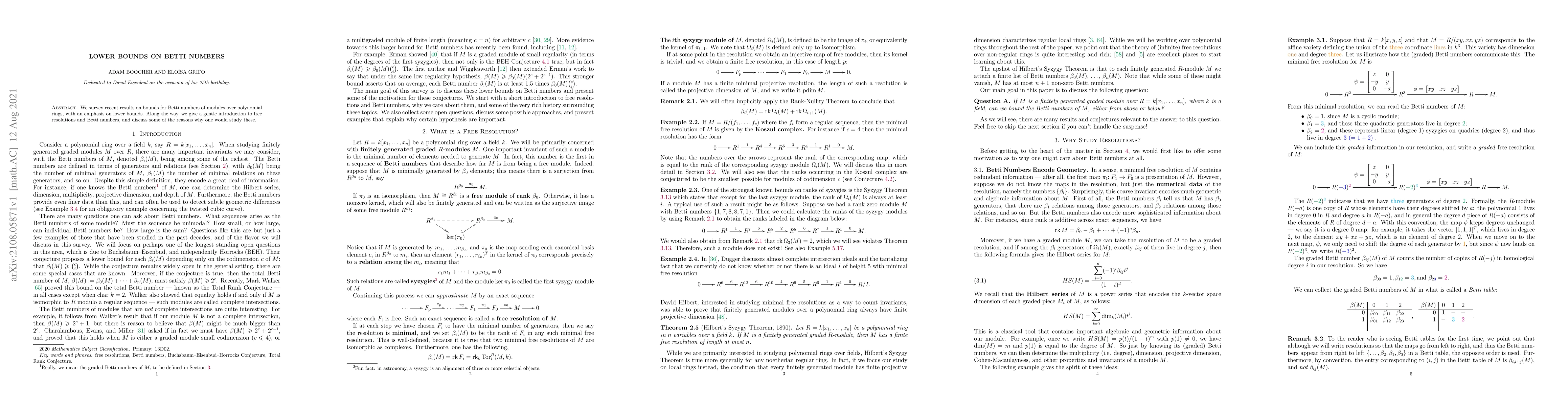 The paper surveys recent results on bounds for Betti numbers of modules over polynomial rings, focusing on lower bounds. It provides an introduction to free resolutions and Betti numbers, and discusses motivations for studying these concepts.