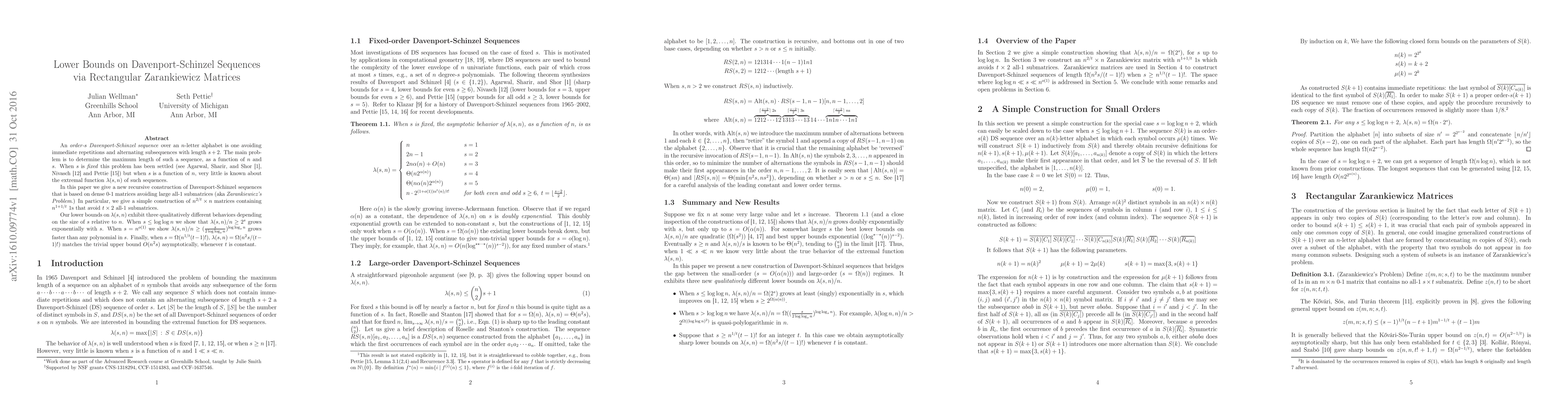 An order-$s$ Davenport-Schinzel sequence over an $n$-letter alphabet is one avoiding immediate repetitions and alternating subsequences with length $s+2$. The main problem is to determine the maximum length of such a sequence, as a function of $n$ and $s$. When $s$ is fixed this problem has been settled but when $s$ is a function of $n$, very little is known about the extremal function $\lambda(s,n)$ of such sequences. In this paper we give a new recursive construction of Davenport-Schinzel sequences that is based on dense 0-1 matrices avoiding large all-1 submatrices (aka Zarankiewicz's Problem.) In particular, we give a simple construction of $n^{2/t} \times n$ matrices containing $n^{1+1/t}$ 1s that avoid $t\times 2$ all-1 submatrices. Our lower bounds on $\lambda(s,n)$ exhibit three qualitatively different behaviors depending on the size of $s$ relative to $n$. When $s \le \log\log n$ we show that $\lambda(s,n)/n \ge 2^s$ grows exponentially with $s$. When $s = n^{o(1)}$ we show $\lambda(s,n)/n \ge (\frac{s}{2\log\log_s n})^{\log\log_s n}$ grows faster than any polynomial in $s$. Finally, when $s=\Omega(n^{1/t}(t-1)!)$, $\lambda(s,n) = \Omega(n^2 s/(t-1)!)$ matches the trivial upper bound $O(n^2s)$ asymptotically, whenever $t$ is constant.