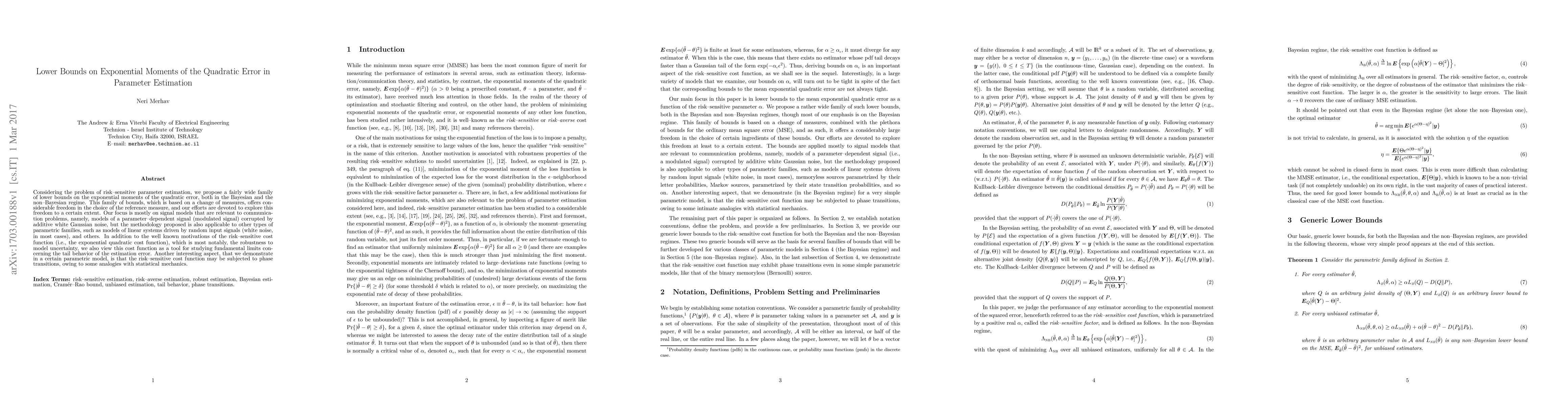 This paper proposes a family of lower bounds on the exponential moments of the quadratic error in risk-sensitive parameter estimation, applicable to both Bayesian and non-Bayesian settings. The methodology is particularly relevant for communication signal models but also extends to linear systems, highlighting robustness and fundamental limits in estimation error.