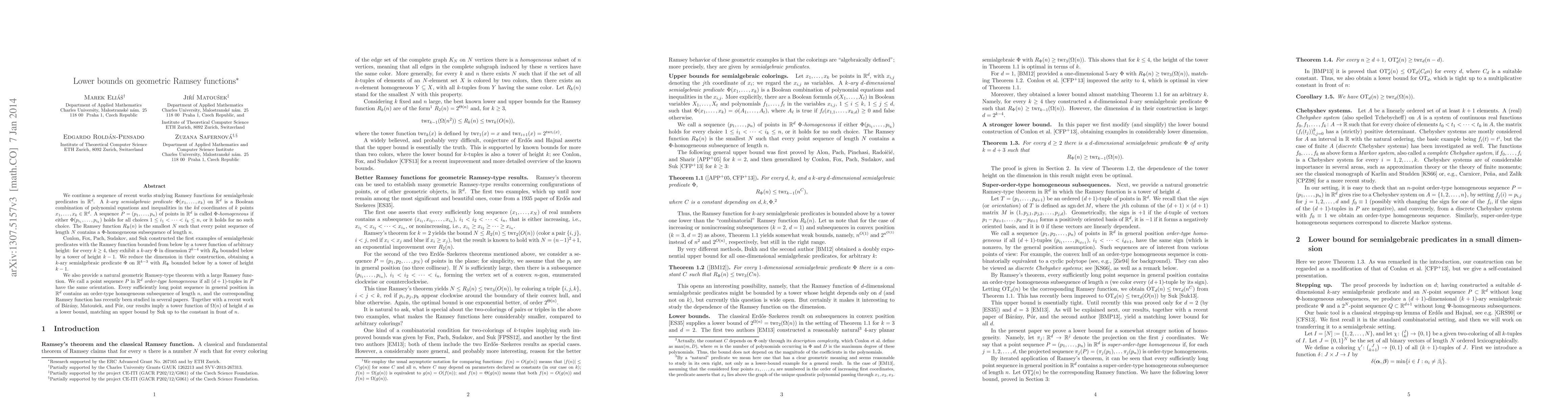 We continue a sequence of recent works studying Ramsey functions for semialgebraic predicates in $\mathbb{R}^d$. A $k$-ary semialgebraic predicate $\Phi(x_1,\ldots,x_k)$ on $\mathbb{R}^d$ is a Boolean combination of polynomial equations and inequalities in the $kd$ coordinates of $k$ points $x_1,\ldots,x_k\in\mathbb{R}^d$. A sequence $P=(p_1,\ldots,p_n)$ of points in $\mathbb{R}^d$ is called $\Phi$-homogeneous if either $\Phi(p_{i_1}, \ldots,p_{i_k})$ holds for all choices $1\le i_1 < \cdots < i_k\le n$, or it holds for no such choice. The Ramsey function $R_\Phi(n)$ is the smallest $N$ such that every point sequence of length $N$ contains a $\Phi$-homogeneous subsequence of length $n$. Conlon, Fox, Pach, Sudakov, and Suk constructed the first examples of semialgebraic predicates with the Ramsey function bounded from below by a tower function of arbitrary height: for every $k\ge 4$, they exhibit a $k$-ary $\Phi$ in dimension $2^{k-4}$ with $R_\Phi$ bounded below by a tower of height $k-1$. We reduce the dimension in their construction, obtaining a $k$-ary semialgebraic predicate $\Phi$ on $\mathbb{R}^{k-3}$ with $R_\Phi$ bounded below by a tower of height $k-1$. We also provide a natural geometric Ramsey-type theorem with a large Ramsey function. We call a point sequence $P$ in $\mathbb{R}^d$ order-type homogeneous if all $(d+1)$-tuples in $P$ have the same orientation. Every sufficiently long point sequence in general position in $\mathbb{R}^d$ contains an order-type homogeneous subsequence of length $n$, and the corresponding Ramsey function has recently been studied in several papers. Together with a recent work of B\'ar\'any, Matou\v{s}ek, and P\'or, our results imply a tower function of $\Omega(n)$ of height $d$ as a lower bound, matching an upper bound by Suk up to the constant in front of $n$.