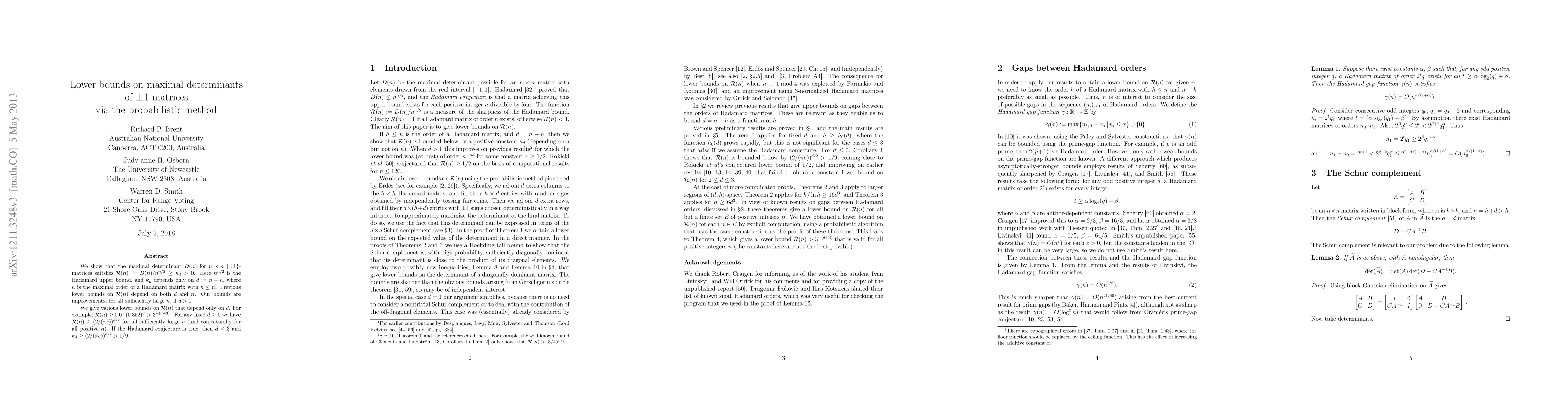 We show that the maximal determinant D(n) for $n \times n$ ${\pm 1}$-matrices satisfies $R(n) := D(n)/n^{n/2} \ge \kappa_d > 0$. Here $n^{n/2}$ is the Hadamard upper bound, and $\kappa_d$ depends only on $d := n-h$, where $h$ is the maximal order of a Hadamard matrix with $h \le n$. Previous lower bounds on R(n) depend on both $d$ and $n$. Our bounds are improvements, for all sufficiently large $n$, if $d > 1$. We give various lower bounds on R(n) that depend only on $d$. For example, $R(n) \ge 0.07 (0.352)^d > 3^{-(d+3)}$. For any fixed $d \ge 0$ we have $R(n) \ge (2/(\pi e))^{d/2}$ for all sufficiently large $n$ (and conjecturally for all positive $n$). If the Hadamard conjecture is true, then $d \le 3$ and $\kappa_d \ge (2/(\pi e))^{d/2} > 1/9$.