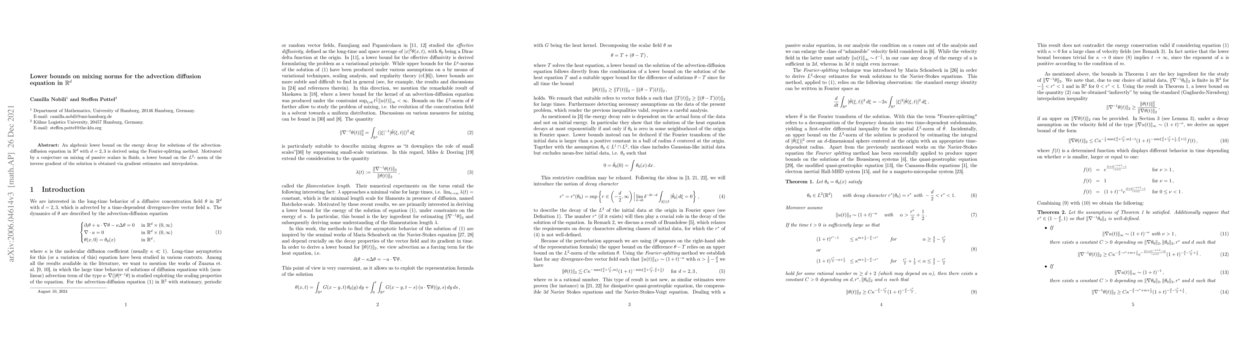 This paper derives an algebraic lower bound on the energy decay for solutions of the advection-diffusion equation in $\mathbb{R}^2$ and $\mathbb{R}^3$ using the Fourier splitting method. It also establishes a lower bound on the $L^2$-norm of the inverse gradient of the solution, motivated by a conjecture on fluid mixing.