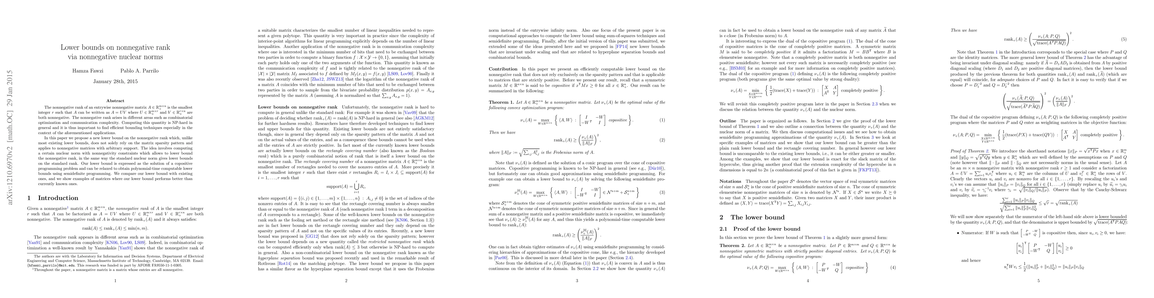 This paper proposes a new lower bound for the nonnegative rank of nonnegative matrices, using a nonnegative nuclear norm that does not depend on the matrix's sparsity pattern. The method involves solving a copositive programming problem, which can be efficiently approximated through semidefinite programming.
