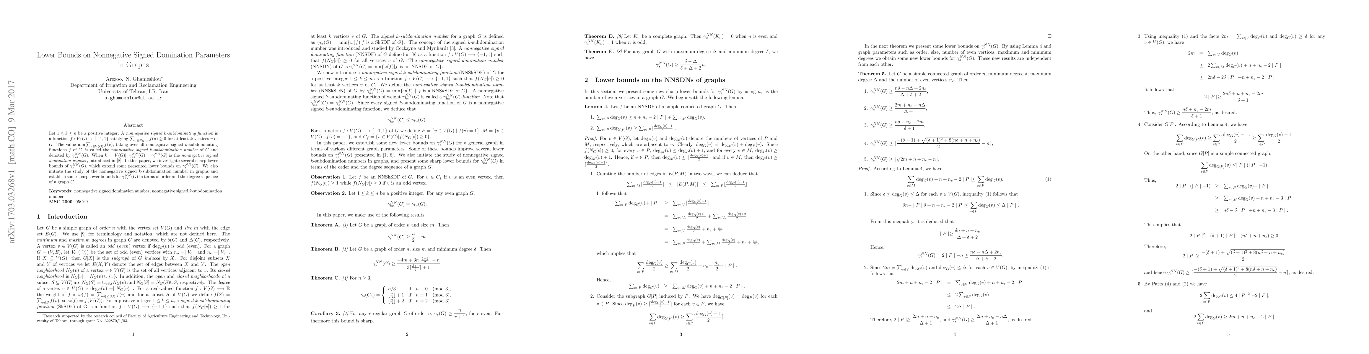 Let $1 \leq k \leq n$ be a positive integer. A {\em nonnegative signed $k$-subdominating function} is a function $f:V(G) \rightarrow \{-1,1\}$ satisfying $\sum_{u\in N_G[v]}f(u) \geq 0$ for at least $k$ vertices $v$ of $G$. The value $\min\sum_{v\in V(G)} f(v)$, taking over all nonnegative signed $k$-subdominating functions $f$ of $G$, is called the {\em nonnegative signed $k$-subdomination number} of $G$ and denoted by $\gamma^{NN}_{ks}(G)$. When $k=|V(G)|$, $\gamma^{NN}_{ks}(G)=\gamma^{NN}_s(G)$ is the {\em nonnegative signed domination number}, introduced in \cite{HLFZ}. In this paper, we investigate several sharp lower bounds of $\gamma^{NN}_s(G)$, which extend some presented lower bounds on $\gamma^{NN}_s(G)$. We also initiate the study of the nonnegative signed $k$-subdomination number in graphs and establish some sharp lower bounds for $\gamma^{NN}_{ks}(G)$ in terms of order and the degree sequence of a graph $G$.