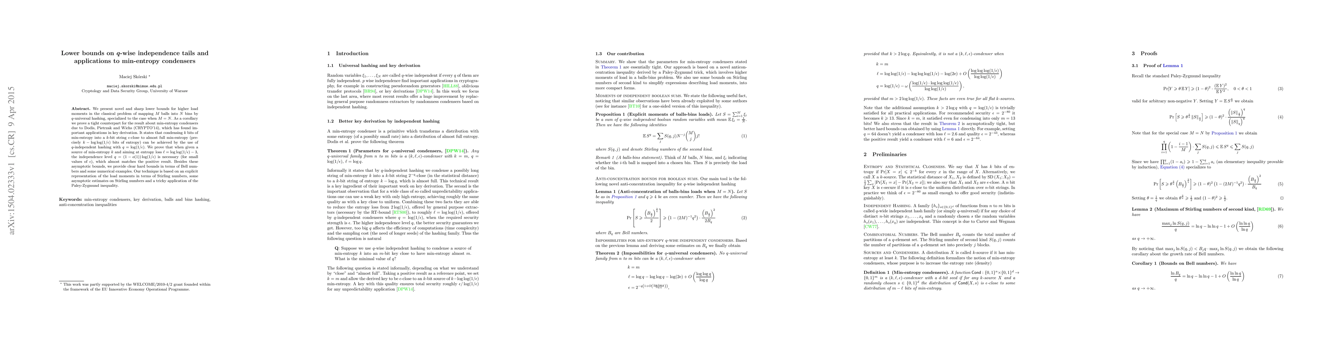 This paper presents sharp lower bounds for higher load moments in $q$-universal hashing when mapping $M$ balls into $N$ bins with $M=N$. It also proves that a min-entropy condenser achieving $k-\log\log(1/\epsilon)$ bits of entropy from $k$ bits of min-entropy requires $q$-independence level of $q=(1-o(1))\log(1/\epsilon)$, nearly matching the positive result.