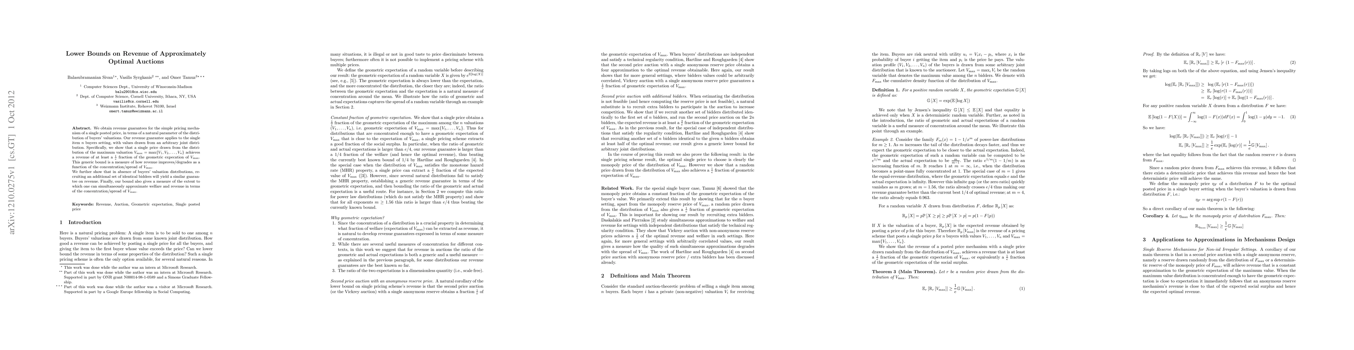 Researchers found that a single price in an auction can achieve at least 1/e fraction of the geometric expectation of the maximum valuation among n buyers, improving revenue as concentration spreads out.