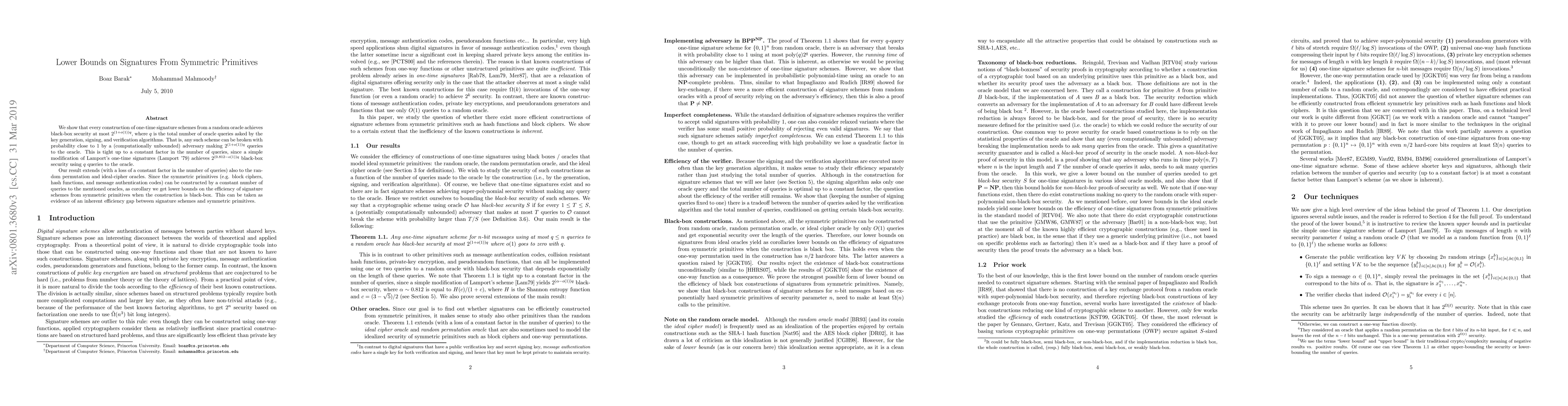 A new research paper sets a lower bound on the security of one-time signature schemes built from symmetric primitives, showing that they can be broken with high probability using an exponentially large number of queries to the underlying oracle.
