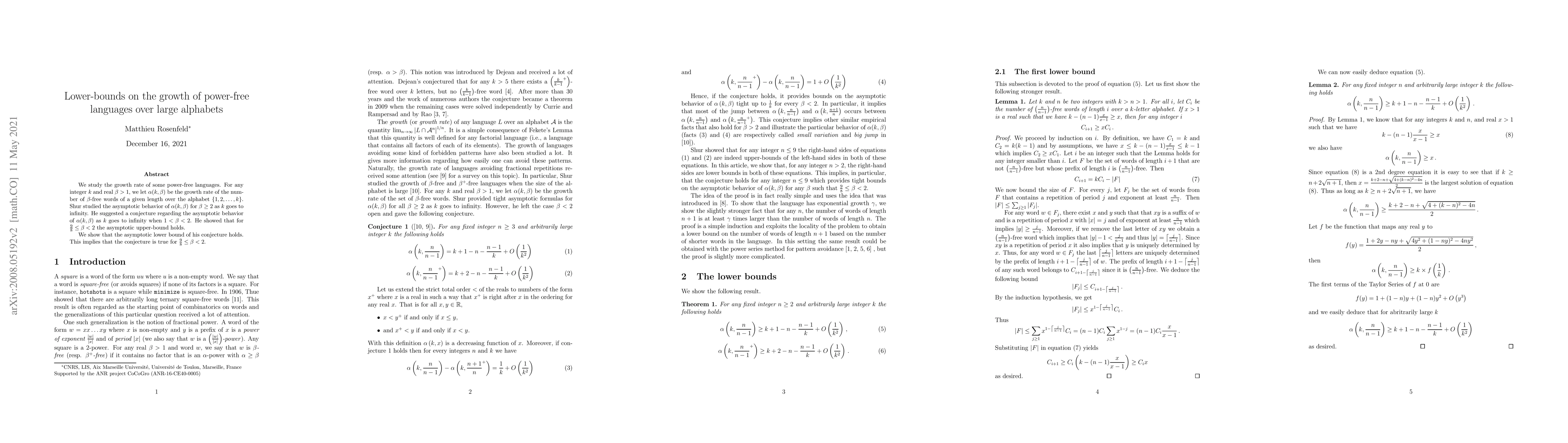 We study the growth rate of some power-free languages. For any integer $k$ and real $\beta>1$, we let $\alpha(k,\beta)$ be the growth rate of the number of $\beta$-free words of a given length over the alphabet $\{1,2,\ldots, k\}$. Shur studied the asymptotic behavior of $\alpha(k,\beta)$ for $\beta\ge2$ as $k$ goes to infinity. He suggested a conjecture regarding the asymptotic behavior of $\alpha(k,\beta)$ as $k$ goes to infinity when $1<\beta<2$. He showed that for $\frac{9}{8}\le\beta<2$ the asymptotic upper-bound holds of his conjecture holds. We show that the asymptotic lower-bound of his conjecture holds. This implies that the conjecture is true for $\frac{9}{8}\le\beta<2$.
