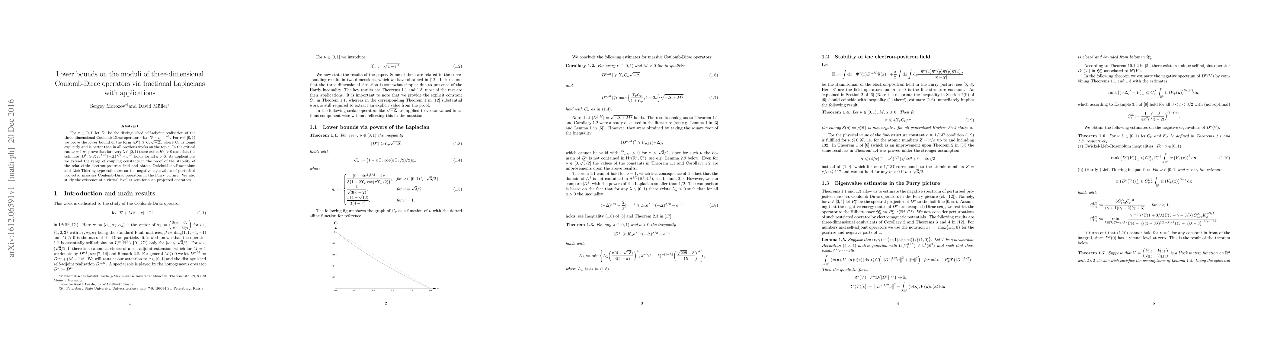This paper establishes improved lower bounds for the moduli of three-dimensional Coulomb-Dirac operators, showing that $|D^\nu| \geqslant C_\nu\sqrt{-\Delta}$ for $\nu\in[0, 1)$, and provides a new estimate for $\nu=1$. Applications include enhanced stability proofs for the relativistic electron-positron field and new estimates on the negative eigenvalues of perturbed projected massless Coulomb-Dirac operators.