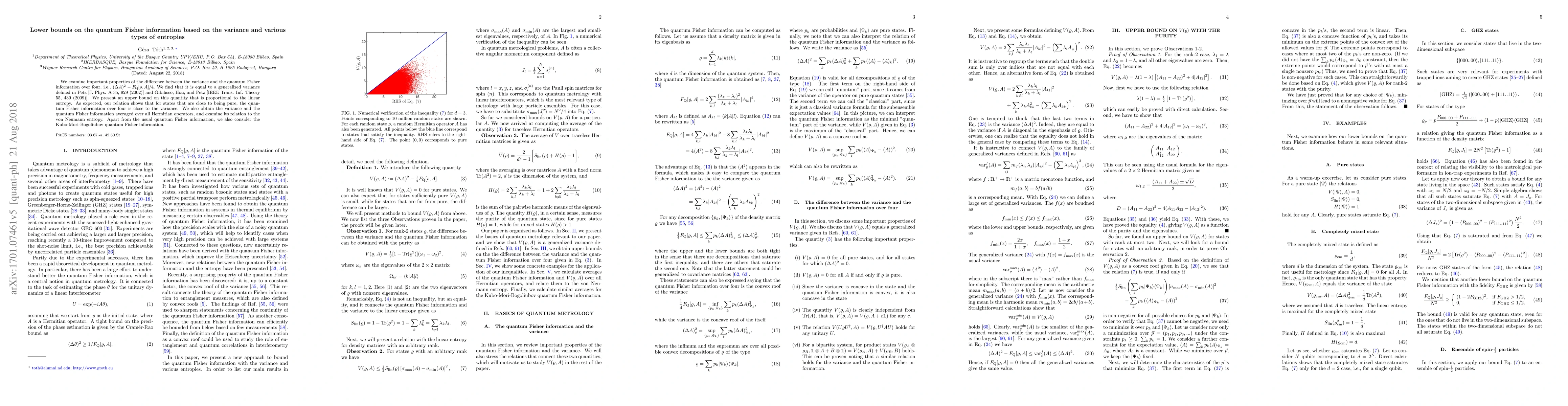 We examine important properties of the difference between the variance and the quantum Fisher information over four, i.e., $(\Delta A)^2-F_{\rm Q}[\varrho,A]/4.$ We find that it is equal to a generalized variance defined in Petz [J. Phys. A 35, 929 (2002)] and Gibilisco, Hiai, and Petz [IEEE Trans. Inf. Theory 55, 439 (2009)]. We present an upper bound on this quantity that is proportional to the linear entropy. As expected, our relation shows that for states that are close to being pure, the quantum Fisher information over four is close to the variance. We also obtain the variance and the quantum Fisher information averaged over all Hermitian operators, and examine its relation to the von Neumann entropy. Apart from the usual quantum Fisher information, we also consider the Kubo-Mori-Bogoliubov quantum Fisher information.