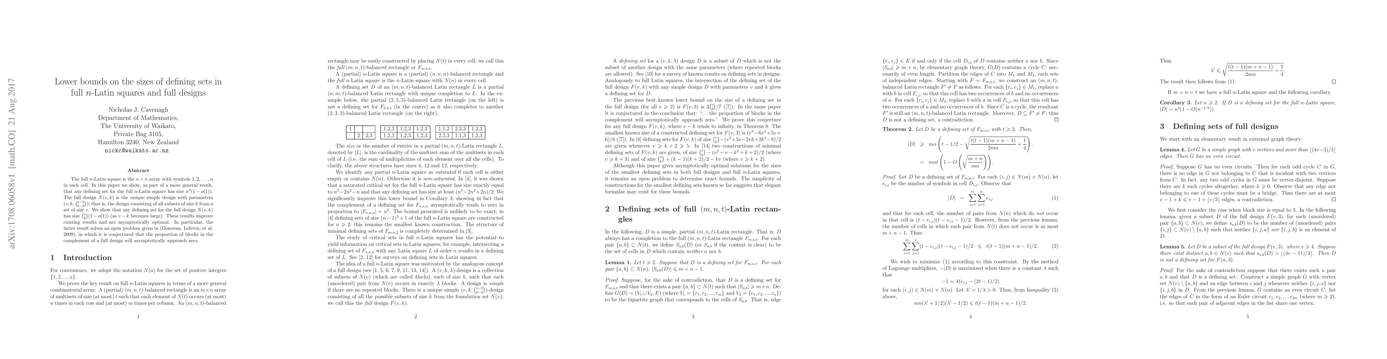 The full $n$-Latin square is the $n\times n$ array with symbols $1,2,\dots ,n$ in each cell. In this paper we show, as part of a more general result, that any defining set for the full $n$-Latin square has size $n^3(1-o(1))$. The full design $N(v,k)$ is the unique simple design with parameters $(v,k,{v-2 \choose k-2})$; that is, the design consisting of all subsets of size $k$ from a set of size $v$. We show that any defining set for the full design $N(v,k)$ has size ${v\choose k}(1-o(1))$ (as $v-k$ becomes large). These results improve existing results and are asymptotically optimal. In particular, the latter result solves an open problem given in (Donovan, Lefevre, et al, 2009), in which it is conjectured that the proportion of blocks in the complement of a full design will asymptotically approach zero.