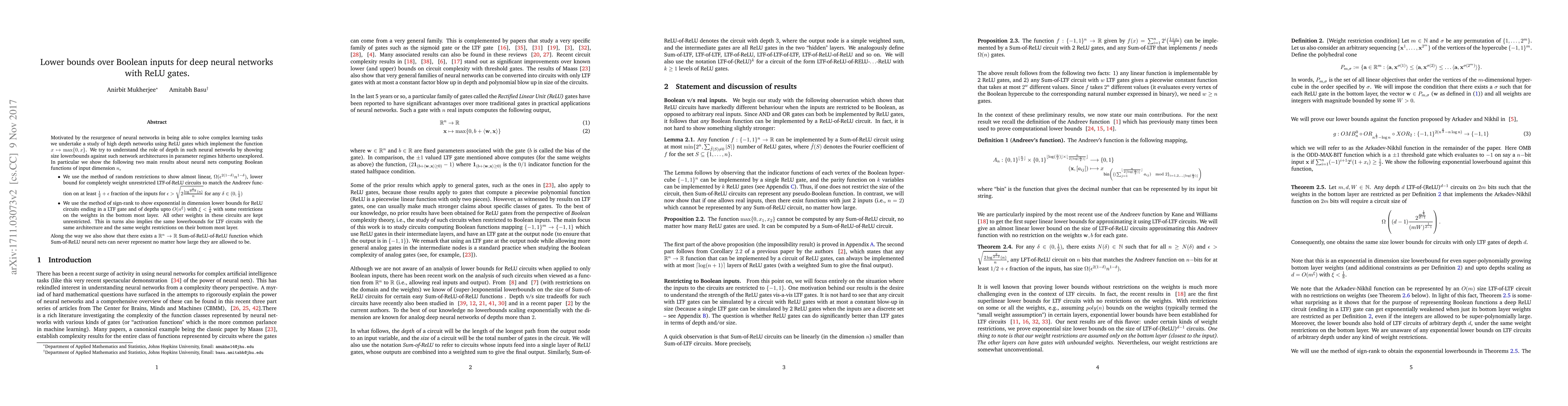 This paper explores the lower bounds for deep neural networks with ReLU gates computing Boolean functions, establishing almost linear lower bounds using random restrictions and exponential dimension lower bounds via the sign-rank method, demonstrating limitations in representing certain functions even with large network sizes.