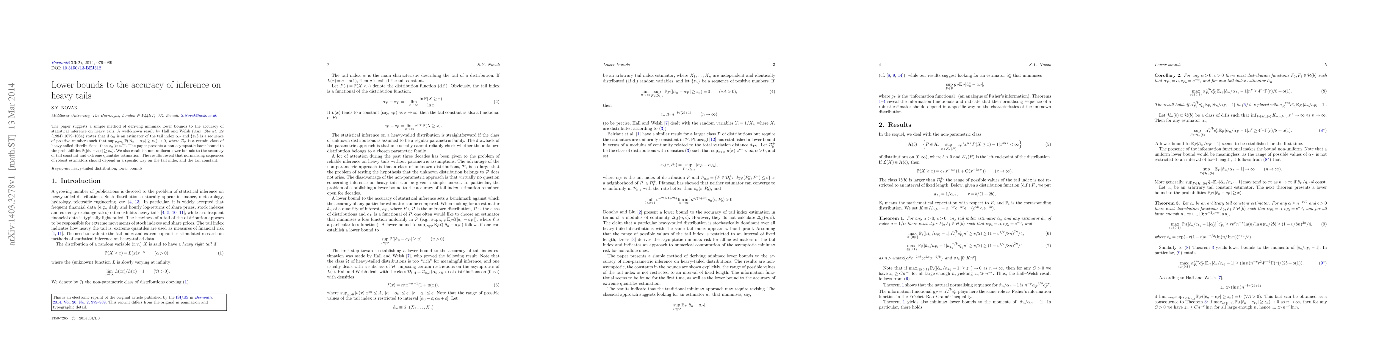 The paper suggests a simple method of deriving minimax lower bounds to the accuracy of statistical inference on heavy tails. A well-known result by Hall and Welsh (Ann. Statist. 12 (1984) 1079-1084) states that if $\hat{\alpha}_n$ is an estimator of the tail index $\alpha_P$ and $\{z_n\}$ is a sequence of positive numbers such that $\sup_{P\in{\mathcal{D}}_r}\mathbb{P}(|\hat{\alpha}_n-\alpha_P|\ge z_n)\to0$, where ${\mathcal{D}}_r$ is a certain class of heavy-tailed distributions, then $z_n\gg n^{-r}$. The paper presents a non-asymptotic lower bound to the probabilities $\mathbb{P}(|\hat{\alpha}_n-\alpha_P|\ge z_n)$. We also establish non-uniform lower bounds to the accuracy of tail constant and extreme quantiles estimation. The results reveal that normalising sequences of robust estimators should depend in a specific way on the tail index and the tail constant.