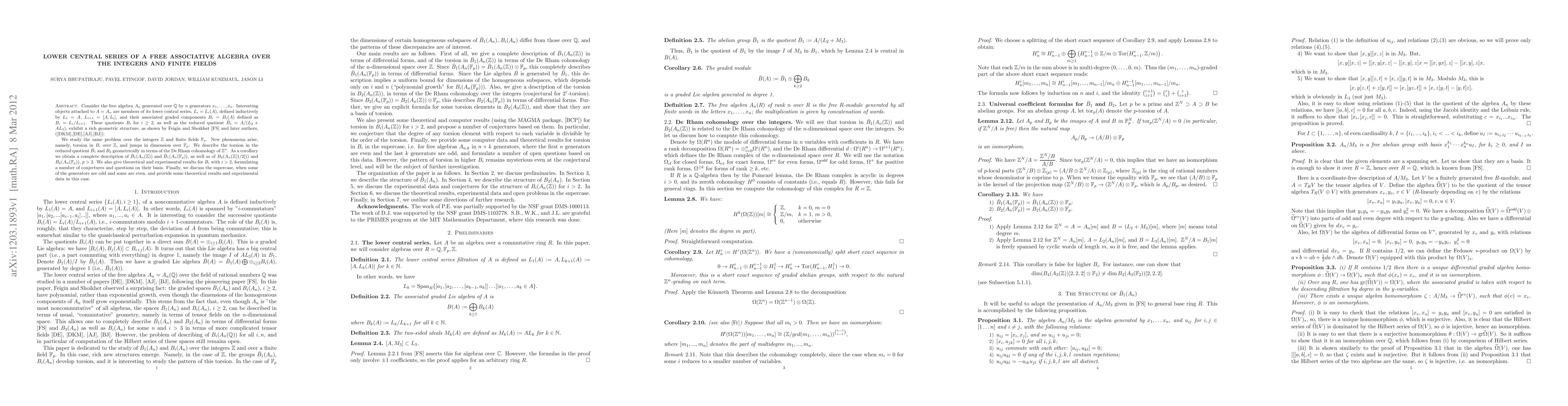 This paper investigates the lower central series of a free associative algebra over the integers and finite fields, revealing torsion in the quotients over Z and dimension jumps over finite fields. It provides a geometric description of the torsion in terms of De Rham cohomology and formulates conjectures for higher series members.