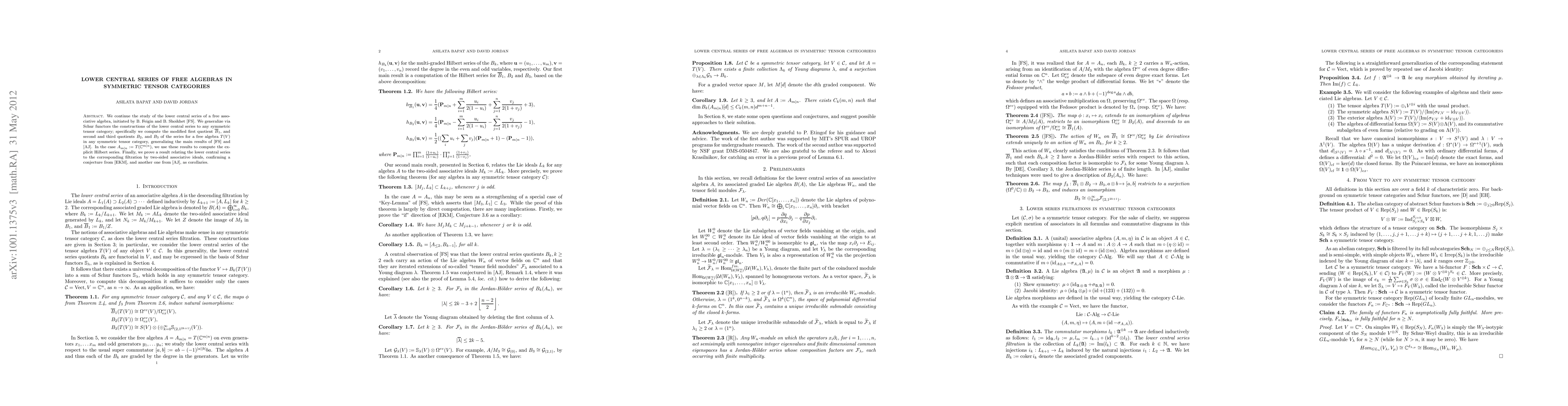 This paper generalizes the study of the lower central series of free associative algebras to symmetric tensor categories using Schur functors, computing specific quotients and proving connections to filtration by two-sided associative ideals, thereby extending prior results and confirming related conjectures.