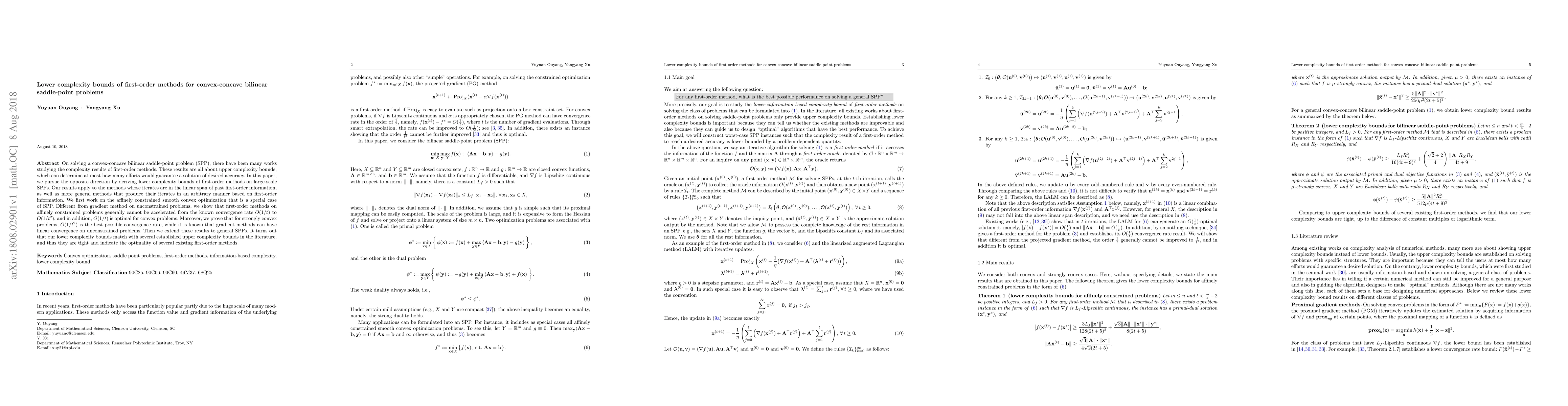On solving a convex-concave bilinear saddle-point problem (SPP), there have been many works studying the complexity results of first-order methods. These results are all about upper complexity bounds, which can determine at most how many efforts would guarantee a solution of desired accuracy. In this paper, we pursue the opposite direction by deriving lower complexity bounds of first-order methods on large-scale SPPs. Our results apply to the methods whose iterates are in the linear span of past first-order information, as well as more general methods that produce their iterates in an arbitrary manner based on first-order information. We first work on the affinely constrained smooth convex optimization that is a special case of SPP. Different from gradient method on unconstrained problems, we show that first-order methods on affinely constrained problems generally cannot be accelerated from the known convergence rate $O(1/t)$ to $O(1/t^2)$, and in addition, $O(1/t)$ is optimal for convex problems. Moreover, we prove that for strongly convex problems, $O(1/t^2)$ is the best possible convergence rate, while it is known that gradient methods can have linear convergence on unconstrained problems. Then we extend these results to general SPPs. It turns out that our lower complexity bounds match with several established upper complexity bounds in the literature, and thus they are tight and indicate the optimality of several existing first-order methods.
