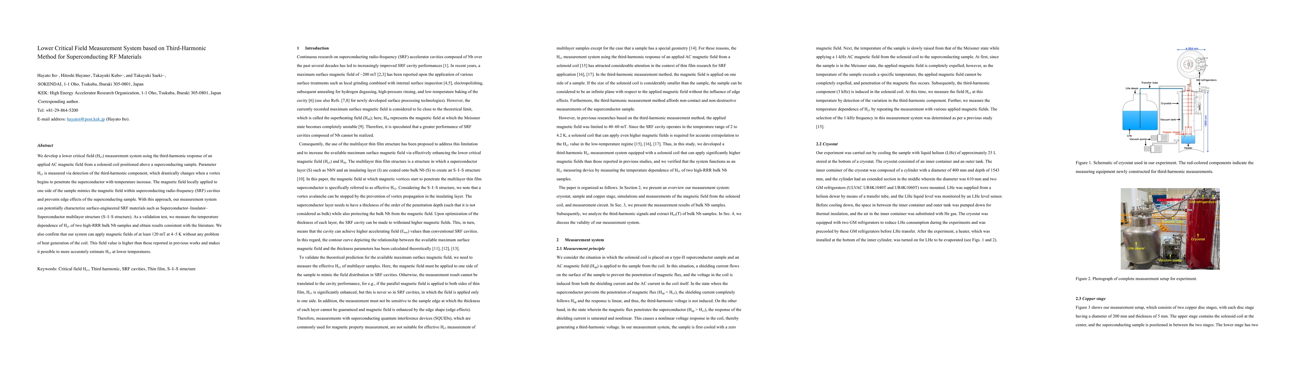 This paper presents a novel measurement system for determining the lower critical field (Hc1) in superconducting RF materials using the third-harmonic method. The system detects changes in the third-harmonic response of an applied AC magnetic field, enabling precise Hc1 measurements and characterizing surface-engineered materials like S-I-S structures. Validation tests on Nb samples confirm the system's accuracy and its capability to apply higher magnetic fields than previous methods.