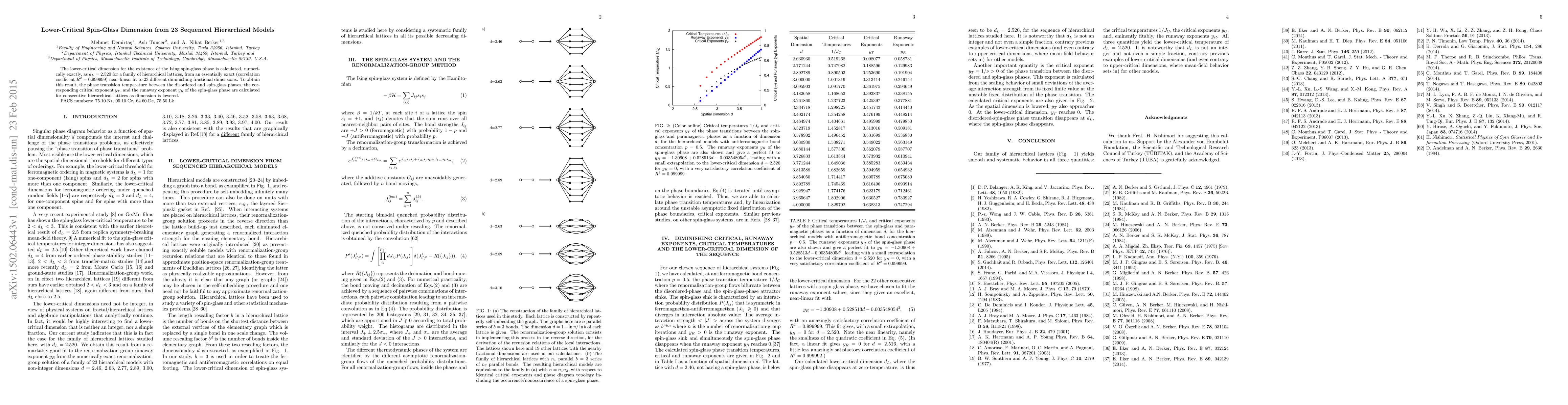 This paper numerically determines the lower-critical dimension $d_L = 2.520$ for the Ising spin-glass phase in a series of 23 hierarchical lattice models, using an exact near-linear fit with correlation coefficient $R^2 = 0.999999$. The study also calculates critical and runaway exponents for the transition between disordered and spin-glass phases.