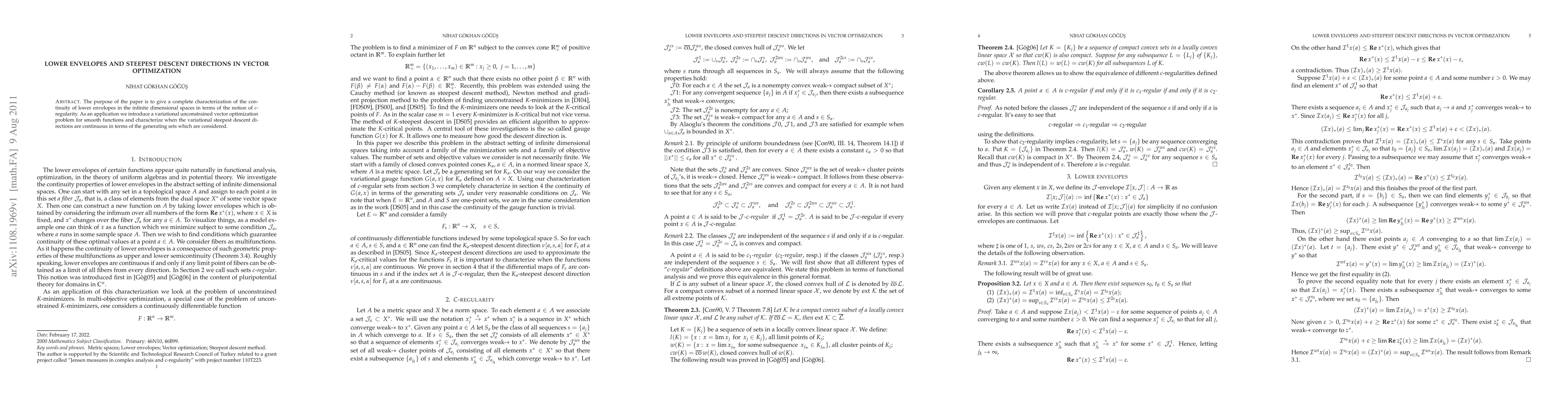 The paper characterizes the continuity of lower envelopes in infinite dimensional spaces based on c-regularity, introducing a variational unconstrained vector optimization problem for smooth functions.