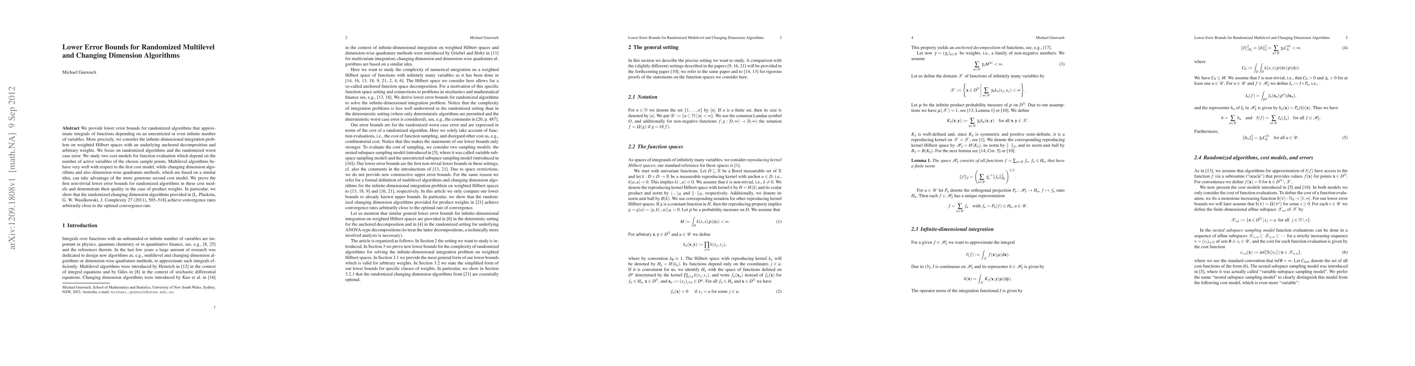 This paper establishes lower error bounds for randomized algorithms approximating integrals of functions with potentially infinite variables, focusing on two cost models. It demonstrates that multilevel algorithms excel under the first cost model, while changing dimension algorithms achieve optimal convergence rates under the second, more generous cost model.