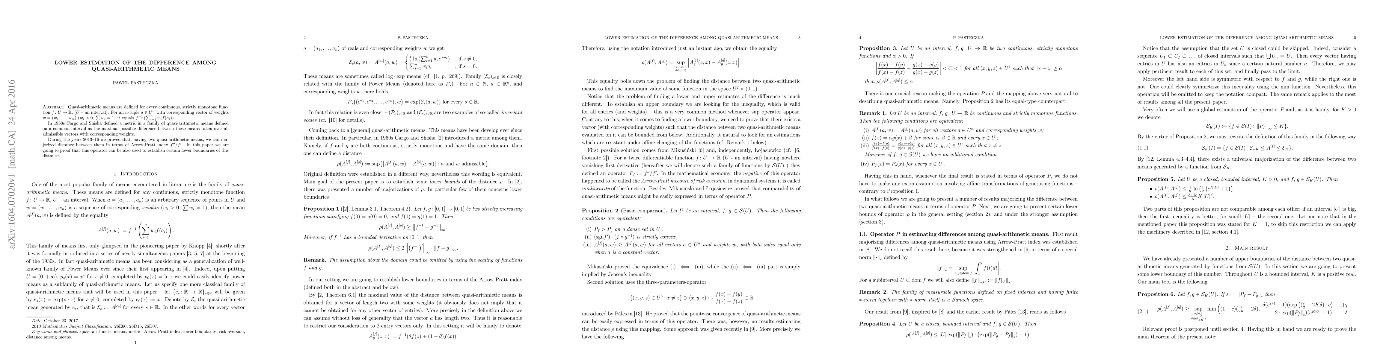 This paper investigates quasi-arithmetic means and demonstrates a method to establish lower boundaries for the difference between these means, utilizing the Arrow-Pratt index $f''/f'$ to majorize the distance. Previous work had established upper bounds, and this study extends the analysis to lower estimations.
