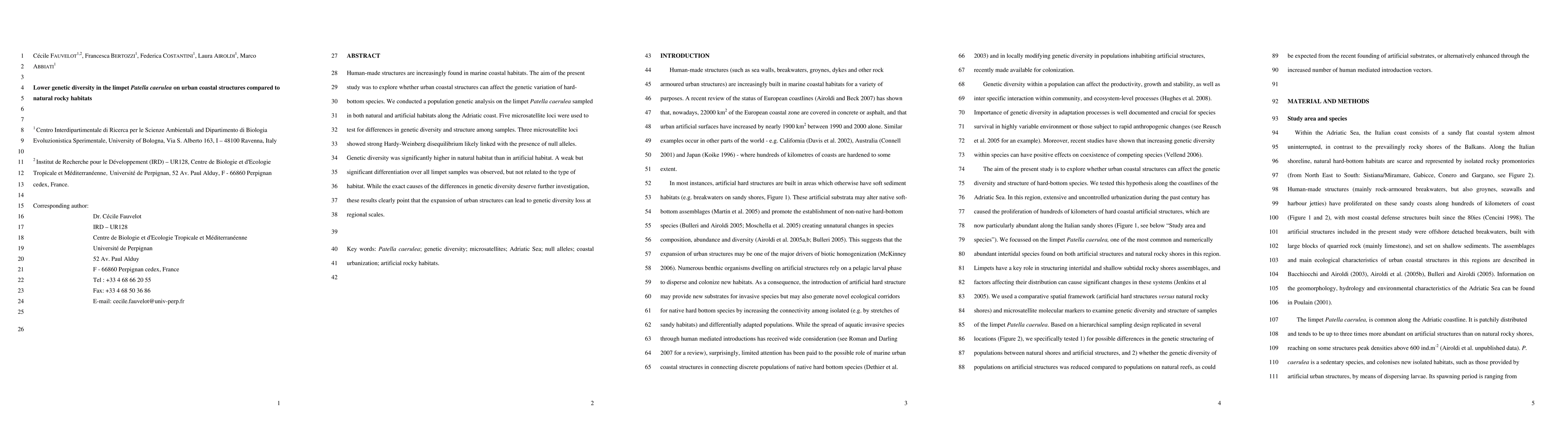 Human-made structures are increasingly found in marine coastal habitats. The aim of the present study was to explore whether urban coastal structures can affect the genetic variation of hard-bottom species. We conducted a population genetic analysis on the limpet Patella caerulea sampled in both natural and artificial habitats along the Adriatic coast. Five microsatellite loci were used to test for differences in genetic diversity and structure among samples. Three microsatellite loci showed strong Hardy-Weinberg disequilibrium likely linked with the presence of null alleles. Genetic diversity was significantly higher in natural habitat than in artificial habitat. A weak but significant differentiation over all limpet samples was observed, but not related to the type of habitat. While the exact causes of the differences in genetic diversity deserve further investigation, these results clearly point that the expansion of urban structures can lead to genetic diversity loss at regional scales.