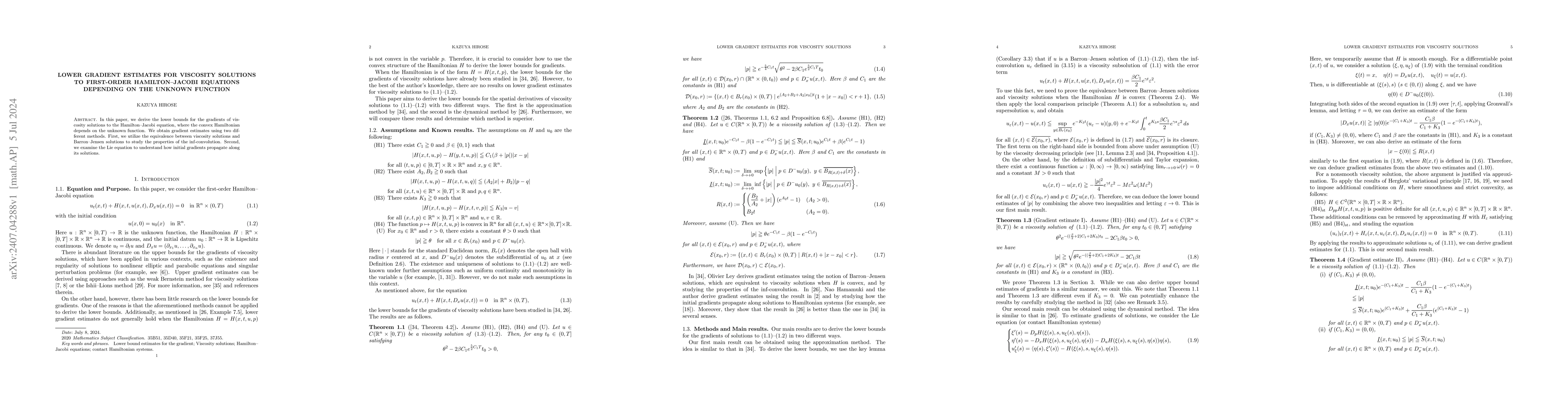 In this paper, we derive the lower bounds for the gradients of viscosity solutions to the Hamilton--Jacobi equation, where the convex Hamiltonian depends on the unknown function. We obtain gradient estimates using two different methods. First, we utilize the equivalence between viscosity solutions and Barron--Jensen solutions to study the properties of the inf-convolution. Second, we examine the Lie equation to understand how initial gradients propagate along its solutions.