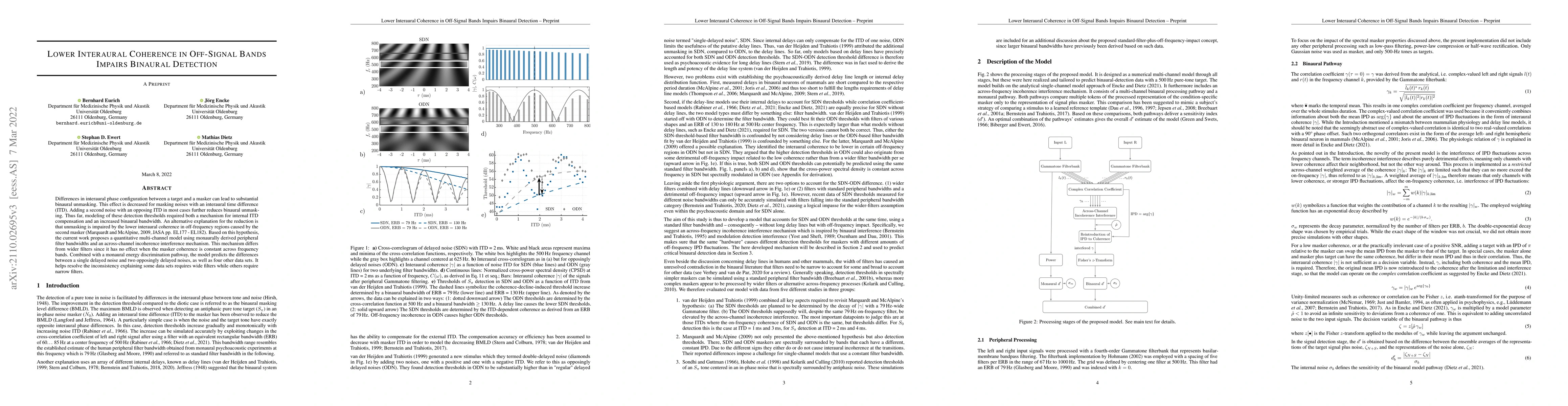 The study proposes a quantitative multi-channel model to explain binaural detection impairments due to lower inter-ear coherence in off-frequency bands, resolving discrepancies in previous models that required either wide or narrow filters. The model incorporates an incoherence interference mechanism and predicts the effects of single versus dual opposingly delayed maskers.