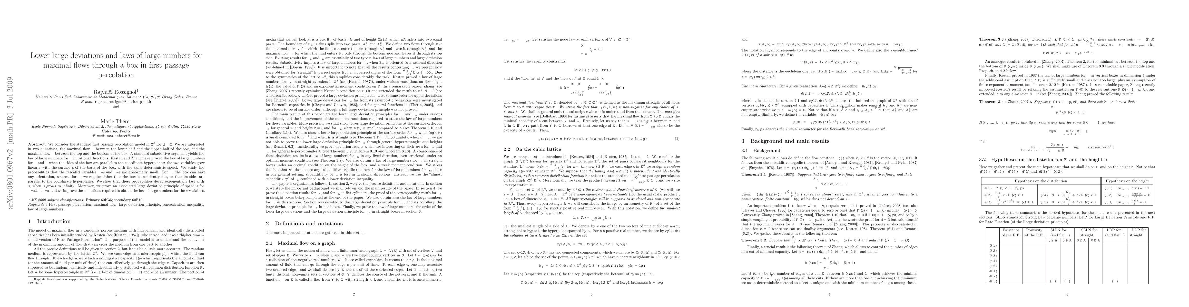 This research paper explores first passage percolation in u2212u2113^d (for d≥2), focusing on maximal flow quantities u03a4 and u03a6. It demonstrates exponential decay of probabilities for abnormally small rescaled variables u03a4/s and u03a6/s, proving a large deviation principle of speed s. The study also refines conditions for the law of large numbers of u03a4 and u03a6, applicable for various box orientations.
