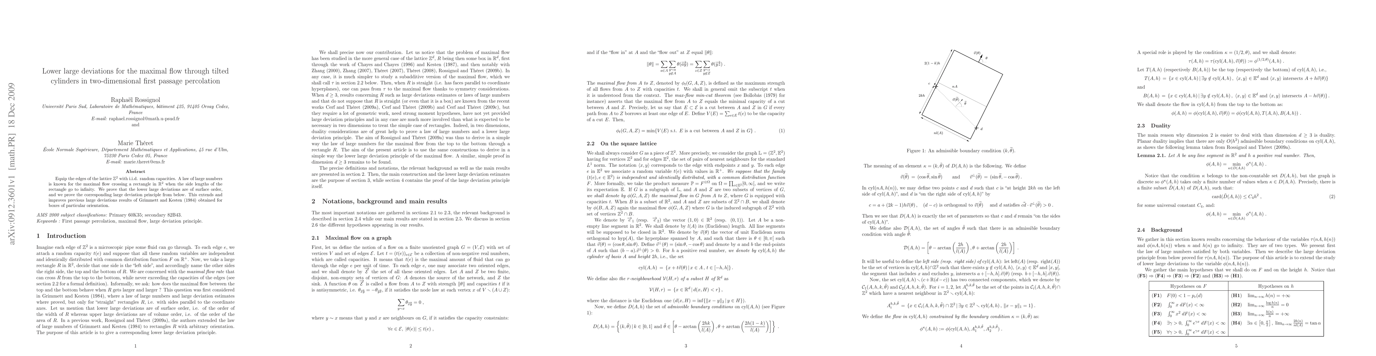 Equip the edges of the lattice $\mathbb{Z}^2$ with i.i.d. random capacities. A law of large numbers is known for the maximal flow crossing a rectangle in $\mathbb{R}^2$ when the side lengths of the rectangle go to infinity. We prove that the lower large deviations are of surface order, and we prove the corresponding large deviation principle from below. This extends and improves previous large deviations results of Grimmett and Kesten (1984) obtained for boxes of particular orientation.