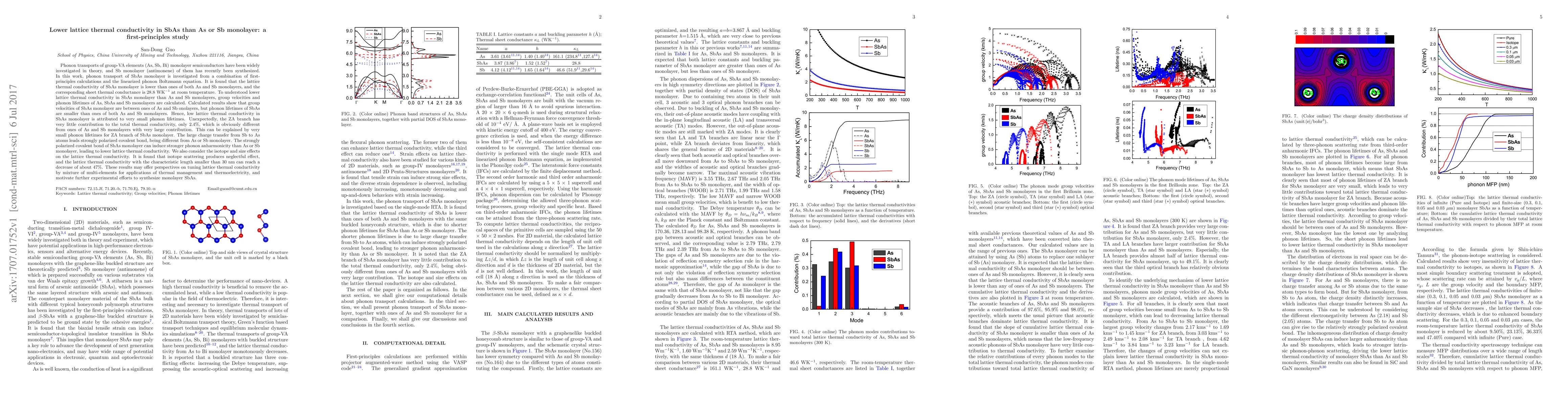 This study uses first-principles calculations to demonstrate that the SbAs monolayer exhibits lower lattice thermal conductivity than As or Sb monolayers, primarily due to shorter phonon lifetimes. The research suggests that the strong covalent bond between Sb and As atoms in SbAs monolayer leads to enhanced phonon anharmonicity, contributing to its low thermal conductivity.
