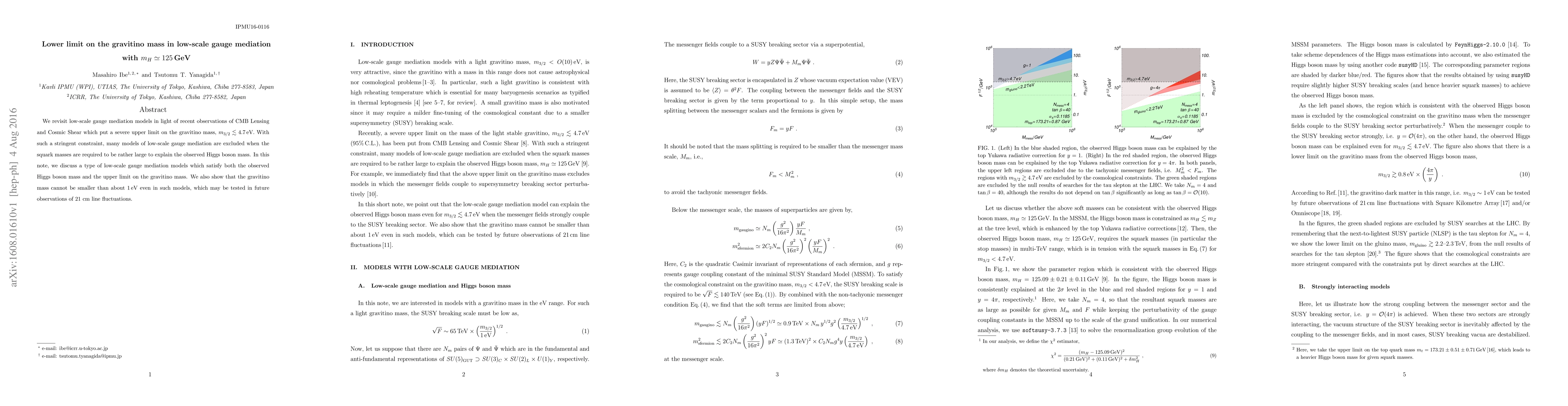 We revisit low-scale gauge mediation models in light of recent observations of CMB Lensing and Cosmic Shear which put a severe upper limit on the gravitino mass, $m_{3/2} \lesssim 4.7$eV. With such a stringent constraint, many models of low-scale gauge mediation are excluded when the squark masses are required to be rather large to explain the observed Higgs boson mass. In this note, we discuss a type of low-scale gauge mediation models which satisfy both the observed Higgs boson mass and the upper limit on the gravitino mass. We also show that the gravitino mass cannot be smaller than about 1eV even in such models, which may be tested in future observations of 21 cm line fluctuations.