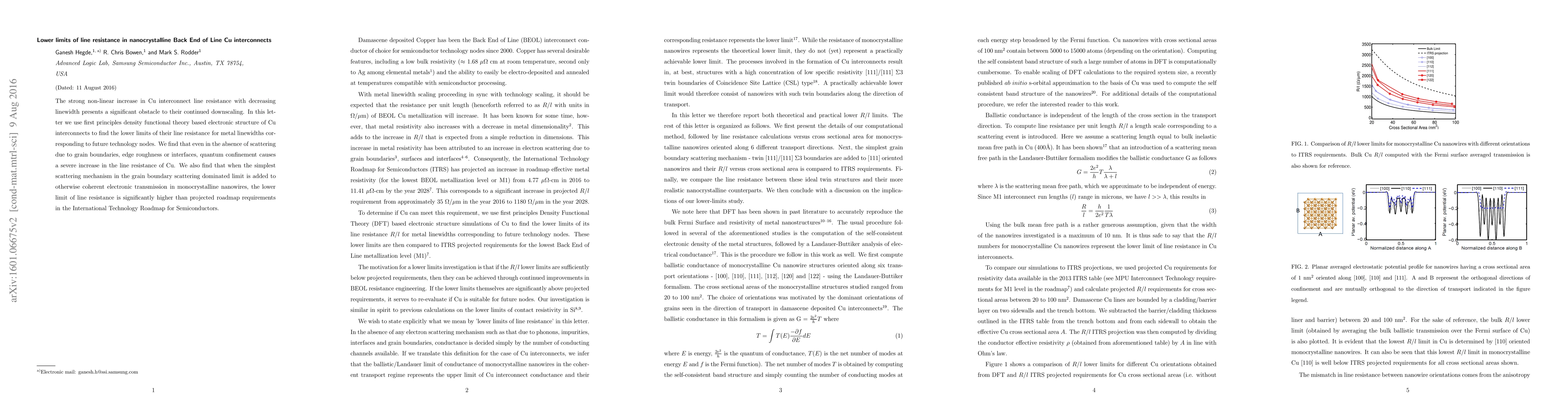 The strong non-linear increase in Cu interconnect line resistance with a decrease in linewidth presents a significant obstacle to their continued downscaling. In this letter we use first principles density functional theory based electronic structure of Cu interconnects to find the lower limits of their line resistance for metal linewidths corresponding to future technology nodes. We find that even in the absence of scattering due to grain boundaries, edge roughness or interfaces, quantum confinement causes a severe reduction in current carrying capacity of Cu. We discuss the causes of transport orientation dependent anisotropy of quantum confinement in Cu. We also find that when the simplest scattering mechanism in the grain boundary scattering dominated limit is added to otherwise coherent electronic transmission in monocrystalline nanowires, the lower limits of line resistance are significantly higher than projected roadmap requirements in the International Technology Roadmap for Semiconductors.