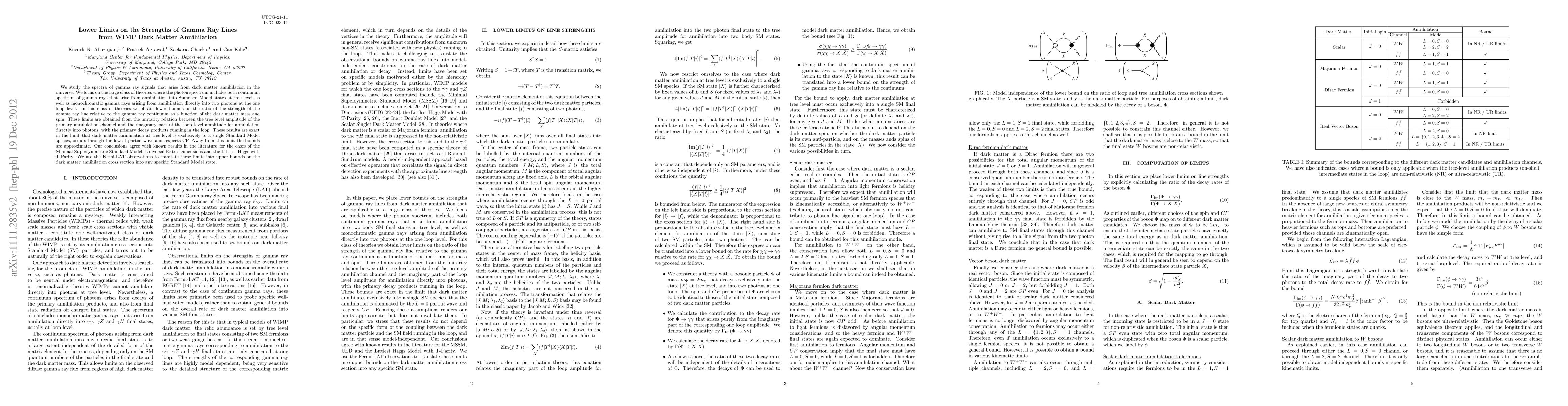 This paper establishes lower limits on the strengths of gamma ray lines from WIMP dark matter annihilation, focusing on both continuum and monochromatic gamma rays. It derives these limits from unitarity relations and agrees with known results in the MSSM, using Fermi-LAT observations to set upper bounds on the dark matter annihilation cross section.