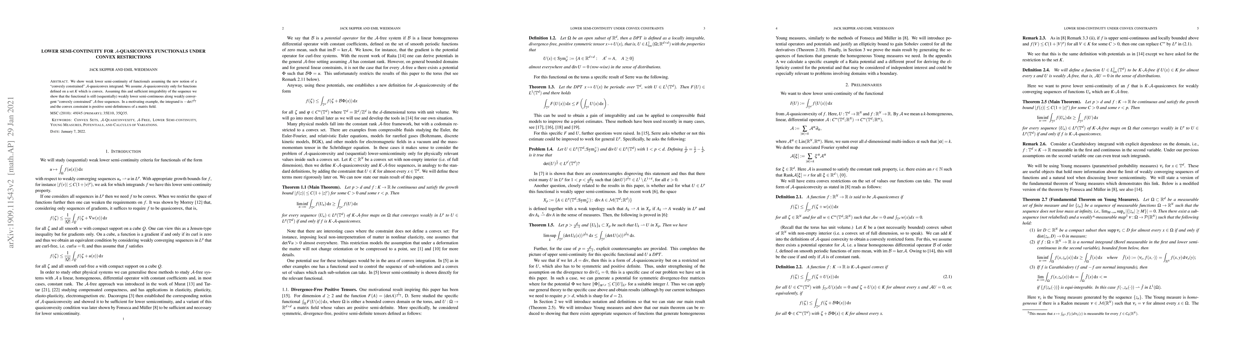 This paper demonstrates the weak lower semi-continuity of $\mathcal A$-quasiconvex functionals under convex restrictions, showing that the functional remains sequentially weakly lower semi-continuous along weakly convergent sequences constrained by convex sets. The motivating example involves an integrand of $-\det^{\frac{1}{d-1}}$ with positive semi-definiteness as the convex constraint.