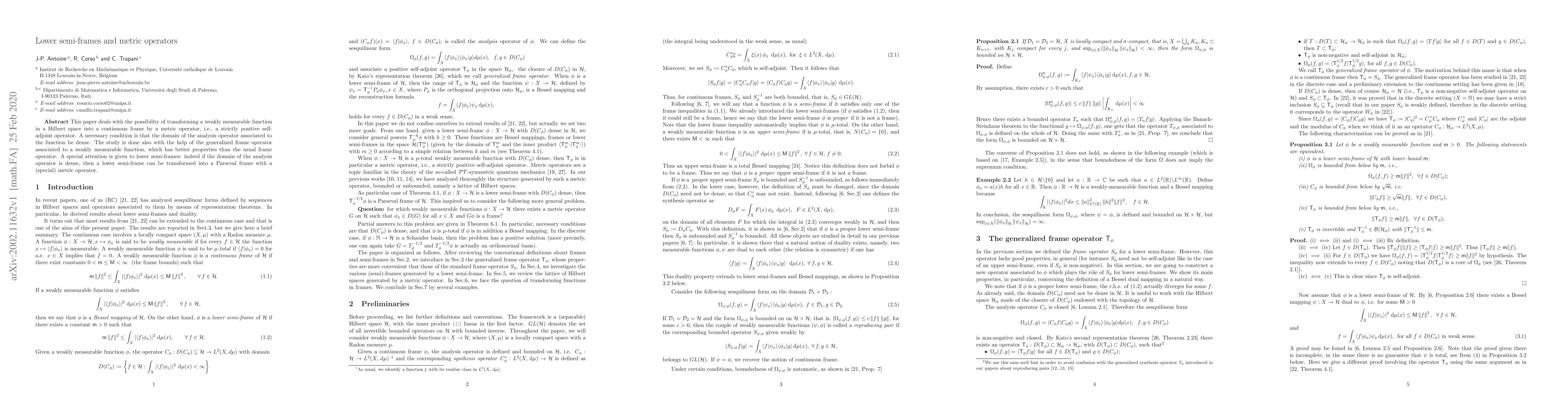 This paper deals with the possibility of transforming a weakly measurable function in a Hilbert space into a continuous frame by a metric operator, i.e., a strictly positive self-adjoint operator. A necessary condition is that the domain of the analysis operator associated to the function be dense. The study is done also with the help of the generalized frame operator associated to a weakly measurable function, which has better properties than the usual frame operator. A special attention is given to lower semi-frames: indeed if the domain of the analysis operator is dense, then a lower semi-frame can be transformed into a Parseval frame with a (special) metric operator.