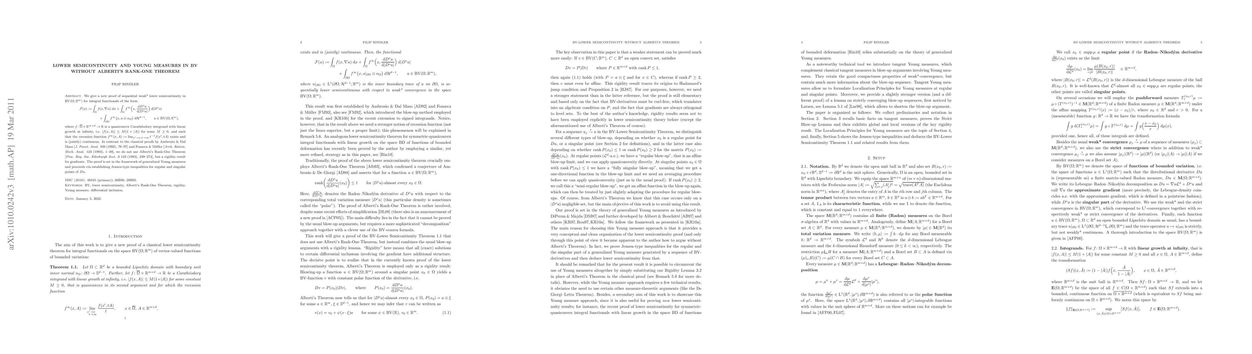 This paper presents a novel proof for the sequential weak* lower semicontinuity of integral functionals in $\BV(\Omega;\R^m)$ using generalized Young measures, without relying on Alberti's Rank-One Theorem, instead employing a rigidity result for gradients.