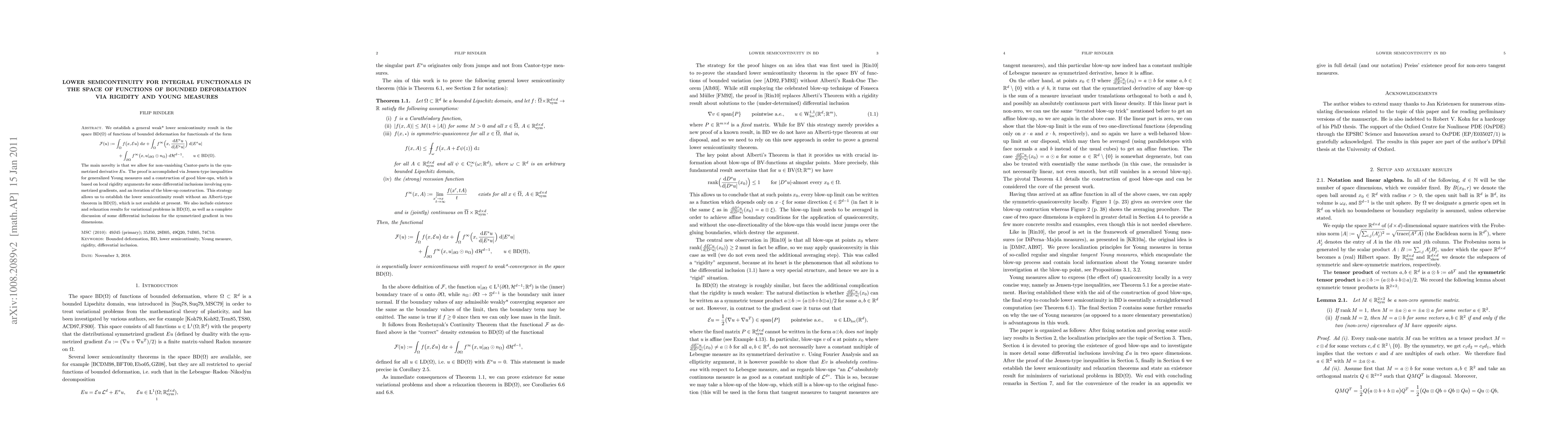 We establish a general weak* lower semicontinuity result in the space $\BD(\Omega)$ of functions of bounded deformation for functionals of the form $$\Fcal(u) := \int_\Omega f \bigl(x, \Ecal u \bigr) \dd x + \int_\Omega f^\infty \Bigl(x, \frac{\di E^s u}{\di \abs{E^s u}} \Bigr) \dd \abs{E^s u} + \int_{\partial \Omega} f^\infty \bigl(x, u|_{\partial \Omega} \odot n_\Omega \bigr) \dd \Hcal^{d-1}$$, $u \in \BD(\Omega)$. The main novelty is that we allow for non-vanishing Cantor-parts in the symmetrized derivative $Eu$. The proof is accomplished via Jensen-type inequalities for generalized Young measures and a construction of good blow-ups, which is based on local rigidity arguments for some differential inclusions involving symmetrized gradients. This strategy allows us to establish the lower semicontinuity result without an Alberti-type theorem in $\BD(\Omega)$, which is not available at present. We also include existence and relaxation results for variational problems in $\BD(\Omega)$, as well as a complete discussion of some differential inclusions for the symmetrized gradient in two dimensions.