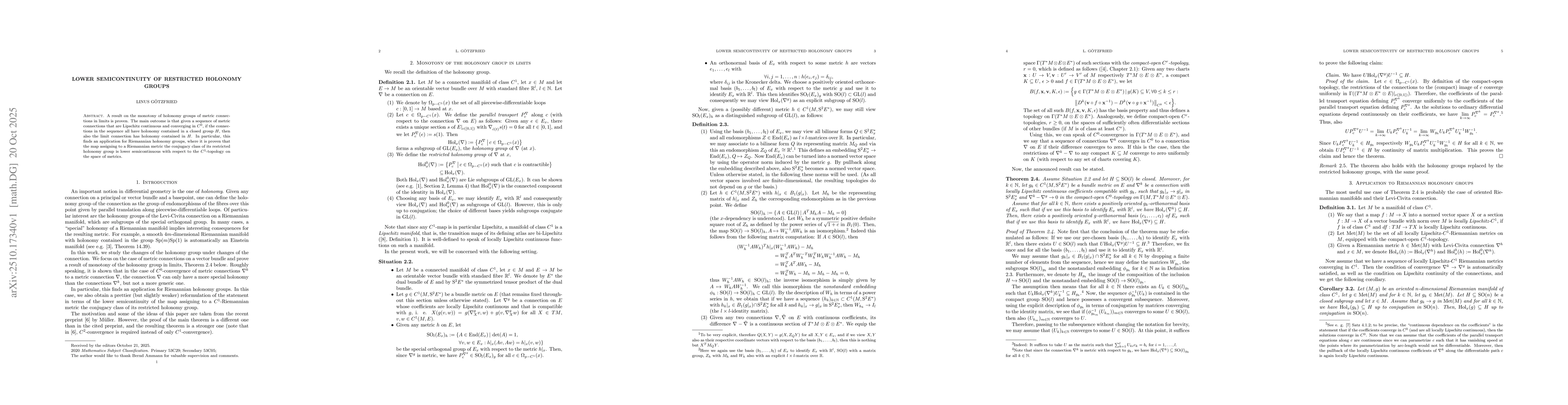 The research employs a combination of differential geometry and analysis to study the lower semicontinuity of restricted holonomy groups in Riemannian manifolds. It utilizes techniques from geometric analysis, including the study of Ricci-flat metrics and connections compatible with positive definite metrics.