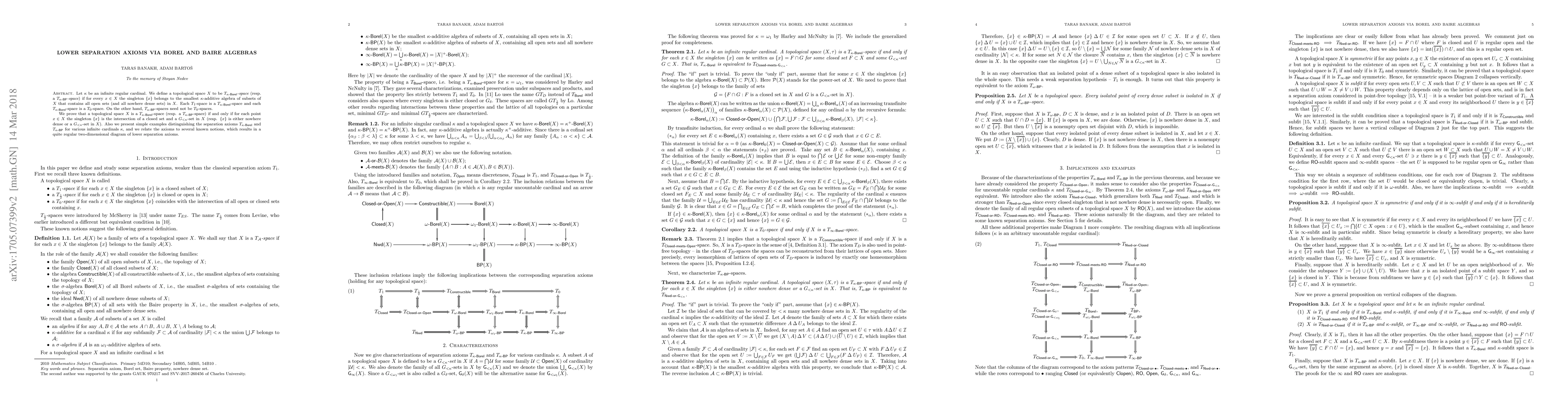 Let $\kappa$ be an infinite regular cardinal. We define a topological space $X$ to be $T_{\kappa-Borel}$-space (resp. a $T_{\kappa-BP}$-space) if for every $x\in X$ the singleton $\{x\}$ belongs to the smallest $\kappa$-additive algebra of subsets of $X$ that contains all open sets (and all nowhere dense sets) in $X$. Each $T_1$-space is a $T_{\kappa-Borel}$-space and each $T_{\kappa-Borel}$-space is a $T_0$-space. On the other hand, $T_{\kappa-BP}$-spaces need not be $T_0$-spaces. We prove that a topological space $X$ is a $T_{\kappa-Borel}$-space (resp. a $T_{\kappa-BP}$-space) if and only if for each point $x\in X$ the singleton $\{x\}$ is the intersection of a closed set and a $G_{<\kappa}$-set in $X$ (resp. $\{x\}$ is either nowhere dense or a $G_{<\kappa}$-set in $X$). Also we present simple examples distinguishing the separation axioms $T_{\kappa-Borel}$ and $T_{\kappa-BP}$ for various infinite cardinals $\kappa$, and we relate the axioms to several known notions, which results in a quite regular two-dimensional diagram of lower separation axioms.