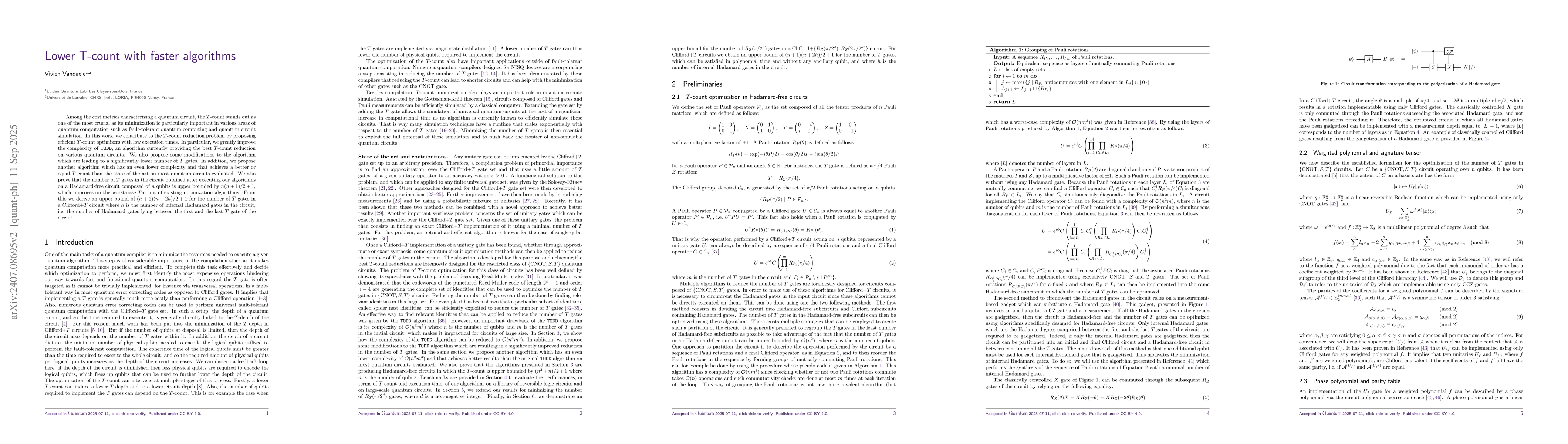 Among the cost metrics characterizing a quantum circuit, the $T$-count stands out as one of the most crucial as its minimization is particularly important in various areas of quantum computation such as fault-tolerant quantum computing and quantum circuit simulation. In this work, we contribute to the $T$-count reduction problem by proposing efficient $T$-count optimizers with low execution times. In particular, we greatly improve the complexity of TODD, an algorithm currently providing the best $T$-count reduction on various quantum circuits. We also propose some modifications to the algorithm which are leading to a significantly lower number of $T$ gates. In addition, we propose another algorithm which has an even lower complexity and that achieves a better or equal $T$-count than the state of the art on most quantum circuits evaluated. We also prove that the number of $T$ gates in the circuit obtained after executing our algorithms on a Hadamard-free circuit composed of $n$ qubits is upper bounded by $n(n + 1)/2 + 1$, which improves on the worst-case $T$-count of existing optimization algorithms. From this we derive an upper bound of $(n + 1)(n + 2h)/2 + 1$ for the number of $T$ gates in a Clifford$+T$ circuit where $h$ is the number of internal Hadamard gates in the circuit, i.e. the number of Hadamard gates lying between the first and the last $T$ gate of the circuit.