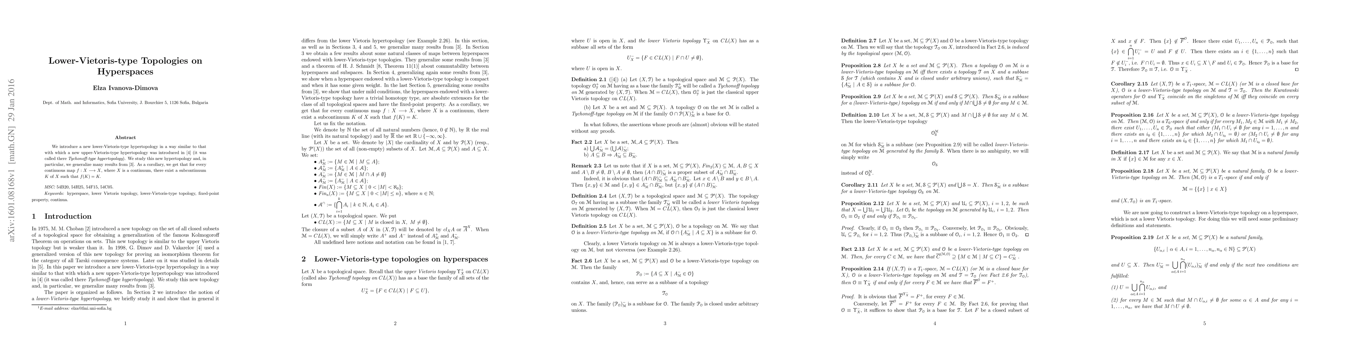 This paper introduces a new lower-Vietoris-type hypertopology on hyperspaces, extending previous work on upper-Vietoris-type hypertopologies. The study generalizes results from earlier research and concludes that for every continuous map on a continuum, there exists a subcontinuum invariant under the map.