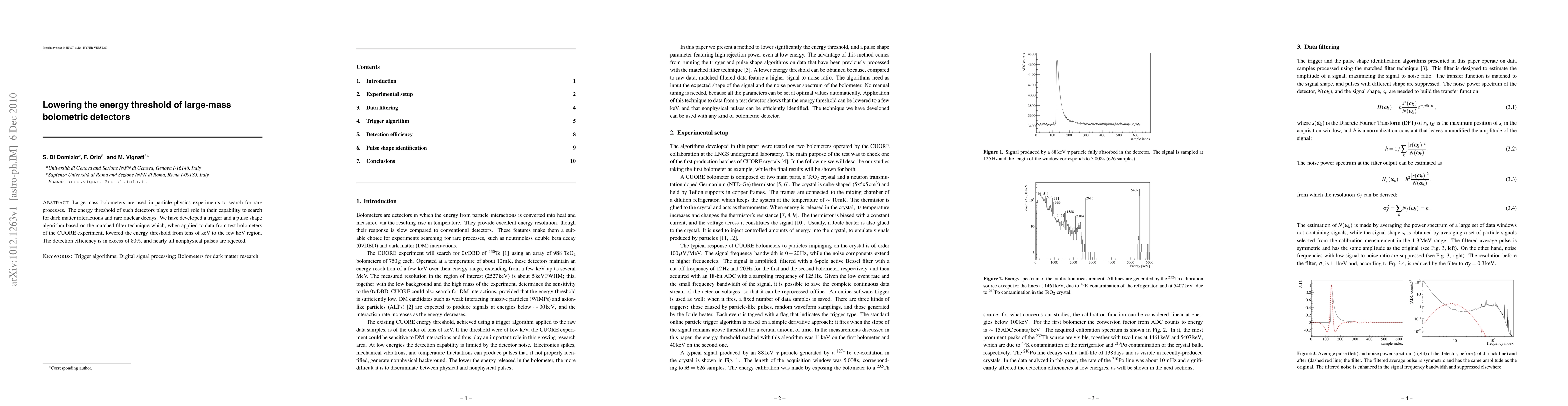 Large-mass bolometers are used in particle physics experiments to search for rare processes. The energy threshold of such detectors plays a critical role in their capability to search for dark matter interactions and rare nuclear decays. We have developed a trigger and a pulse shape algorithm based on the matched filter technique which, when applied to data from test bolometers of the CUORE experiment, lowered the energy threshold from tens of keV to the few keV region. The detection efficiency is in excess of 80%, and nearly all nonphysical pulses are rejected.