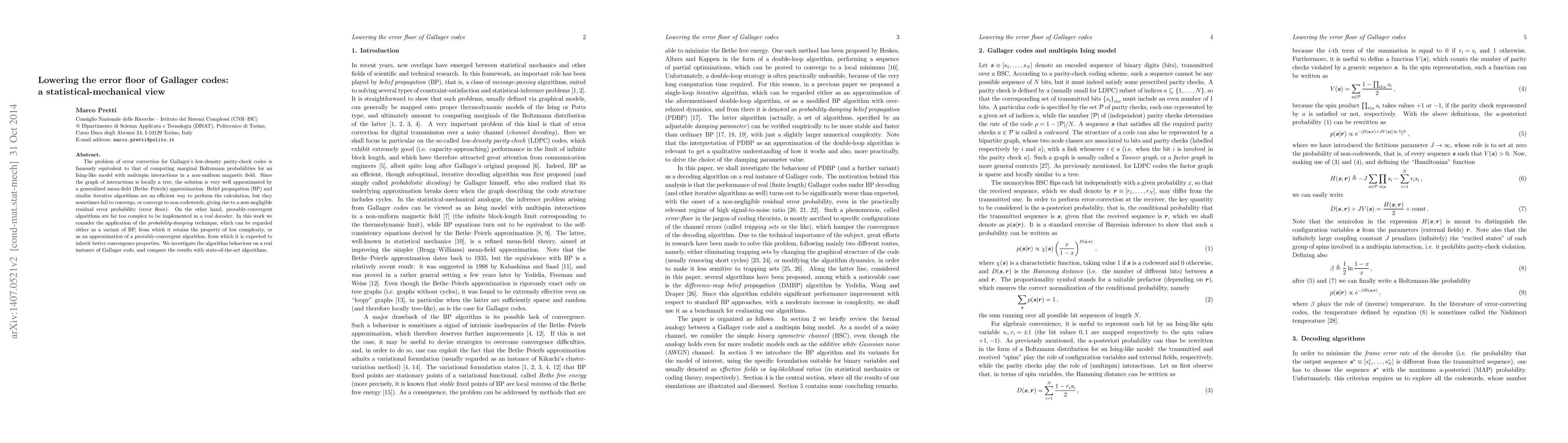 This paper explores the use of probability-damping techniques to reduce the error floor in Gallager's low-density parity-check codes, which are linked to computing marginal Boltzmann probabilities in an Ising-like model. The proposed method aims to combine the low complexity of belief propagation with the better convergence properties of provably-convergent algorithms, demonstrating its effectiveness on a real Gallager code instance.