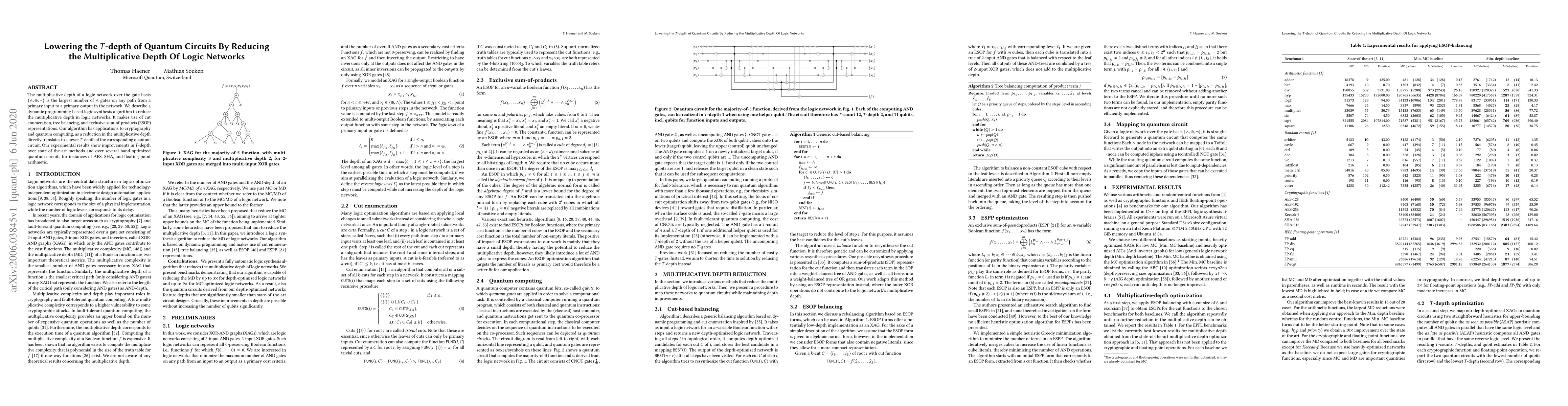 This paper presents a dynamic programming algorithm to reduce the multiplicative depth in logic networks, which directly lowers the $T$-depth of corresponding quantum circuits. The method employs cut enumeration, tree balancing, and ESOP representations, demonstrating improvements over existing methods in quantum circuits for AES, SHA, and floating-point arithmetic.