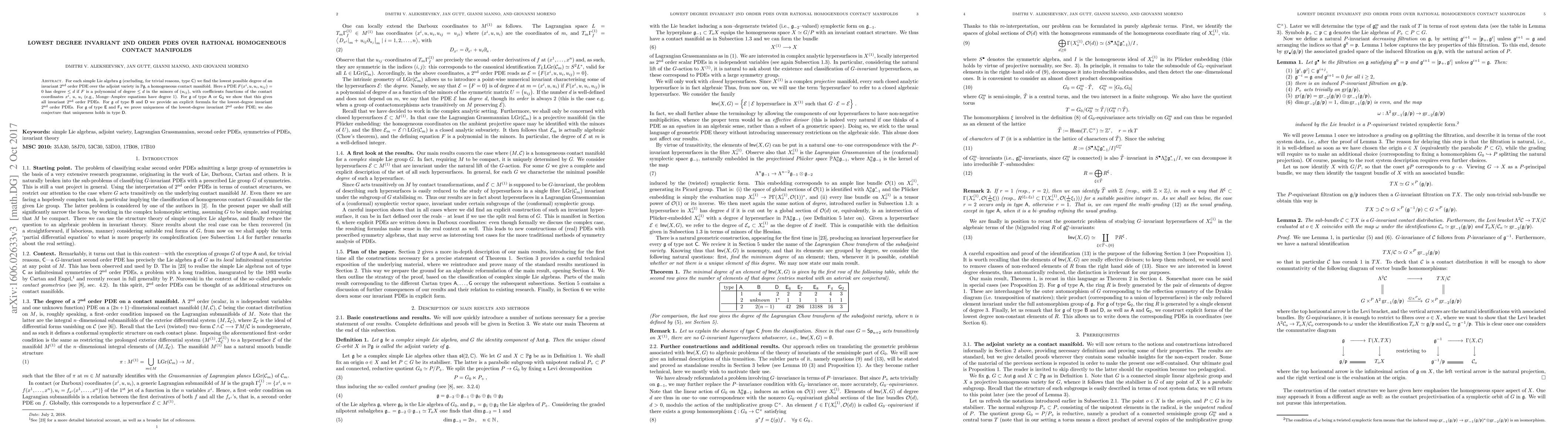 For each simple Lie algebra $\mathfrak{g}$ (excluding, for trivial reasons, type ${\sf C}$) we find the lowest possible degree of an invariant second-order PDE over the adjoint variety in $\mathbb{P}\mathfrak{g}$, a homogeneous contact manifold. Here a PDE $F(x^i,u,u_i,u_{ij})=0$ has degree $\le d$ if $F$ is a polynomial of degree $\le d$ in the minors of $(u_{ij})$, with coefficients functions of the contact coordinates $x^i$, $u$, $u_i$ (e.g., Monge-Amp\`ere equations have degree 1). For $\mathfrak{g}$ of type ${\sf A}$ or ${\sf G}$ we show that this gives all invariant second-order PDEs. For $\mathfrak{g}$ of type ${\sf B}$ and ${\sf D}$ we provide an explicit formula for the lowest-degree invariant second-order PDEs. For $\mathfrak{g}$ of type ${\sf E}$ and ${\sf F}$ we prove uniqueness of the lowest-degree invariant second-order PDE; we also conjecture that uniqueness holds in type ${\sf D}$.