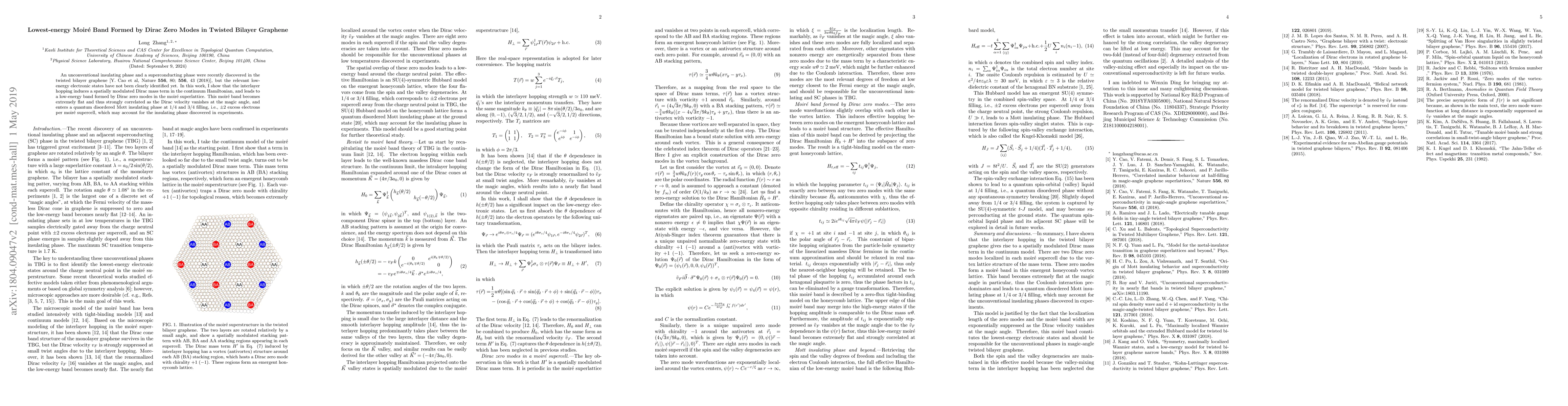 An unconventional insulating phase and a superconducting phase were recently discovered in the twisted bilayer graphene [Y. Cao et al, Nature {\bf 556}, 80; {\bf 556}, 43 (2018)], but the relevant low-energy electronic states have not been clearly identified yet. In this work, I show that the interlayer hopping induces a spatially modulated Dirac mass term in the continuum Hamiltonian, and leads to a low-energy band formed by Dirac zero modes in the moir\'e superlattice. This moir\'e band becomes extremely flat and thus strongly correlated as the Dirac velocity vanishes at the magic angle, and enters a quantum disordered Mott insulating phase at $1/4$ and $3/4$ filling, i.e., $\pm 2$ excess electrons per moir\'e supercell, which may account for the insulating phase discovered in experiments.