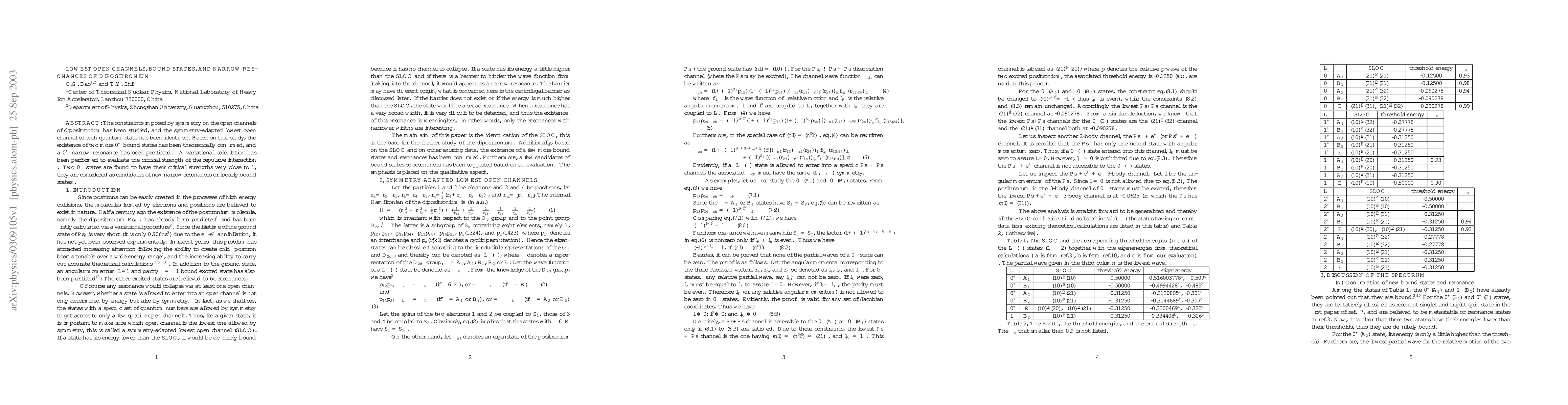 The constraints imposed by symmetry on the open channels of dipositronium has been studied, and the symmetry-adapted lowest open channel of each quantum state has been identified. Based on this study, the existence of two more 0^+ bound states has been theoretically confirmed, and a 0^+ narrow resonance has been predicted. A variational calculation has been performed to evaluate the critical strength of the repulsive interaction . Two 0^- states are found to have their critical strengths very close to 1, they are considered as candidates of new narrow resonances or loosely bound states .