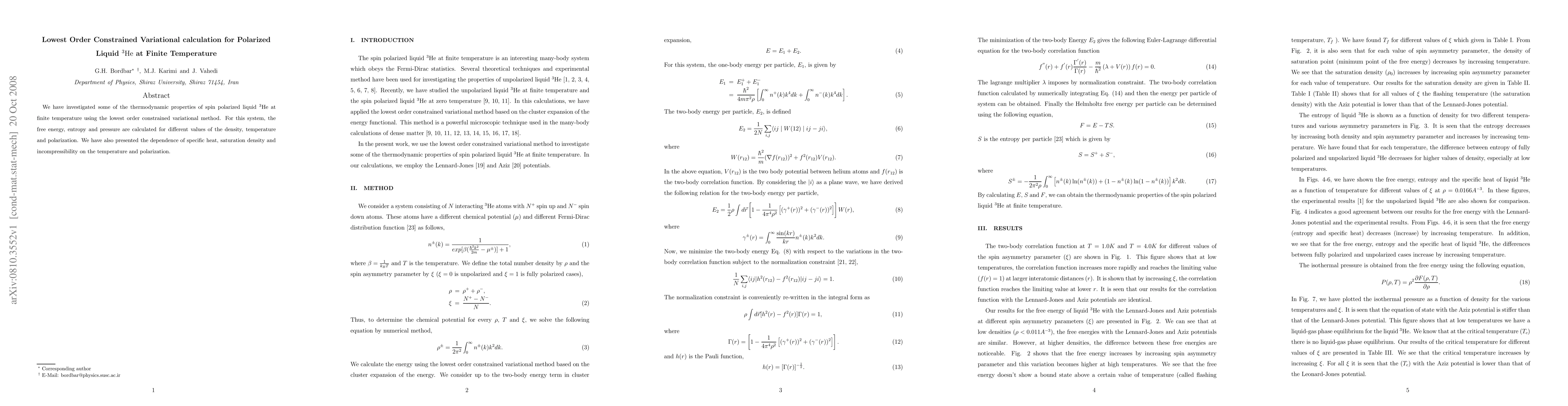 We have investigated some of the thermodynamic properties of spin polarized liquid $^3\mathrm{He}$ at finite temperature using the lowest order constrained variational method. For this system, the free energy, entropy and pressure are calculated for different values of the density, temperature and polarization. We have also presented the dependence of specific heat, saturation density and incompressibility on the temperature and polarization.